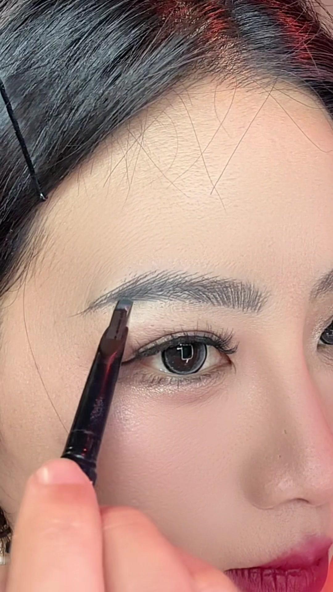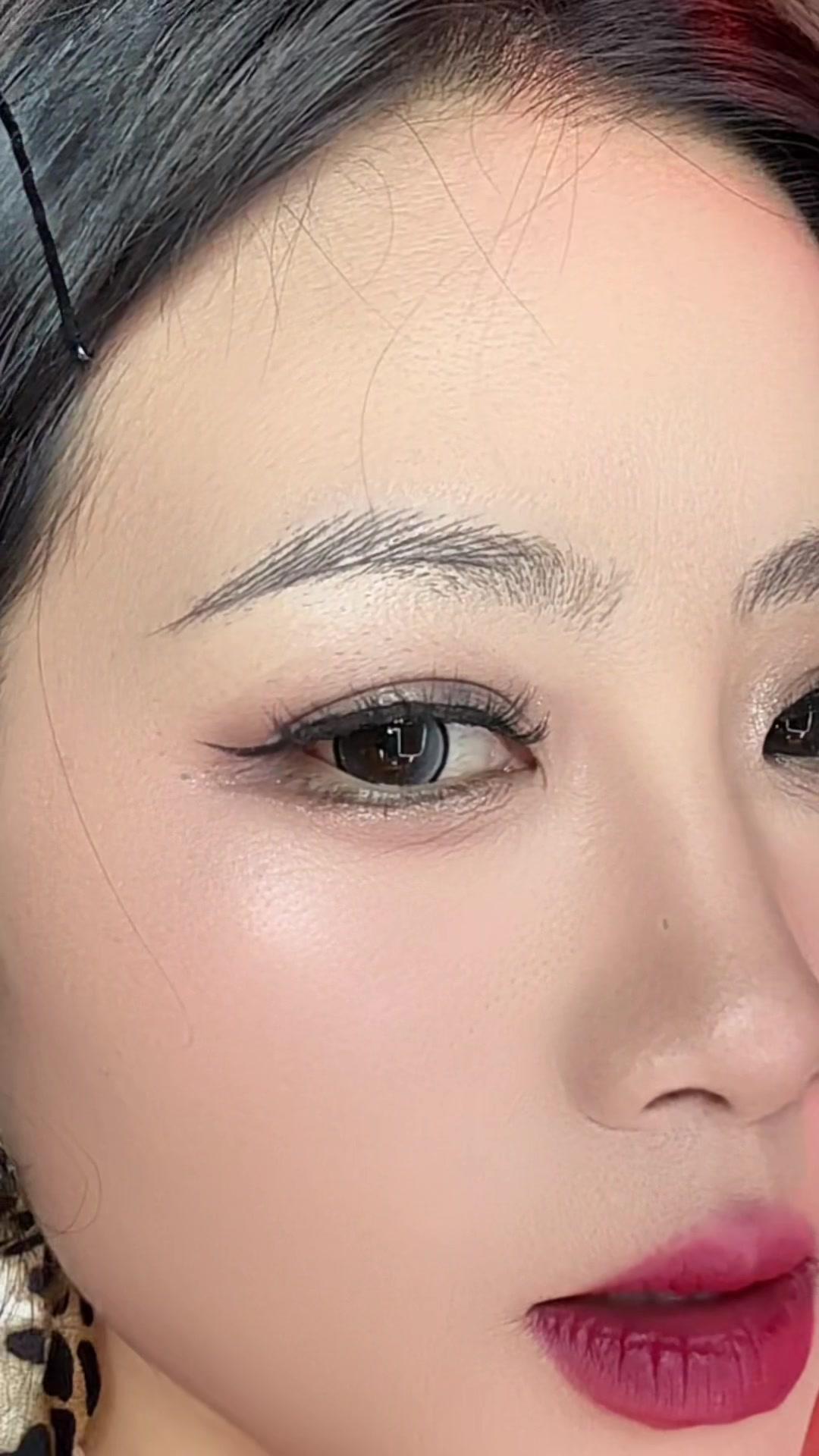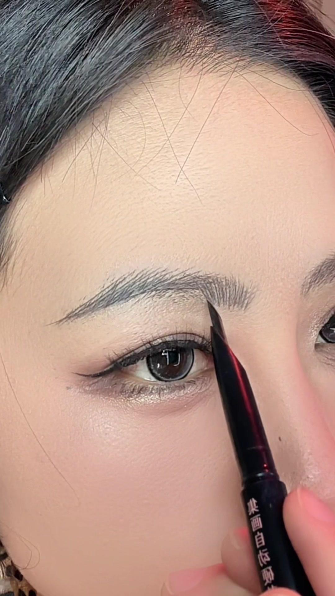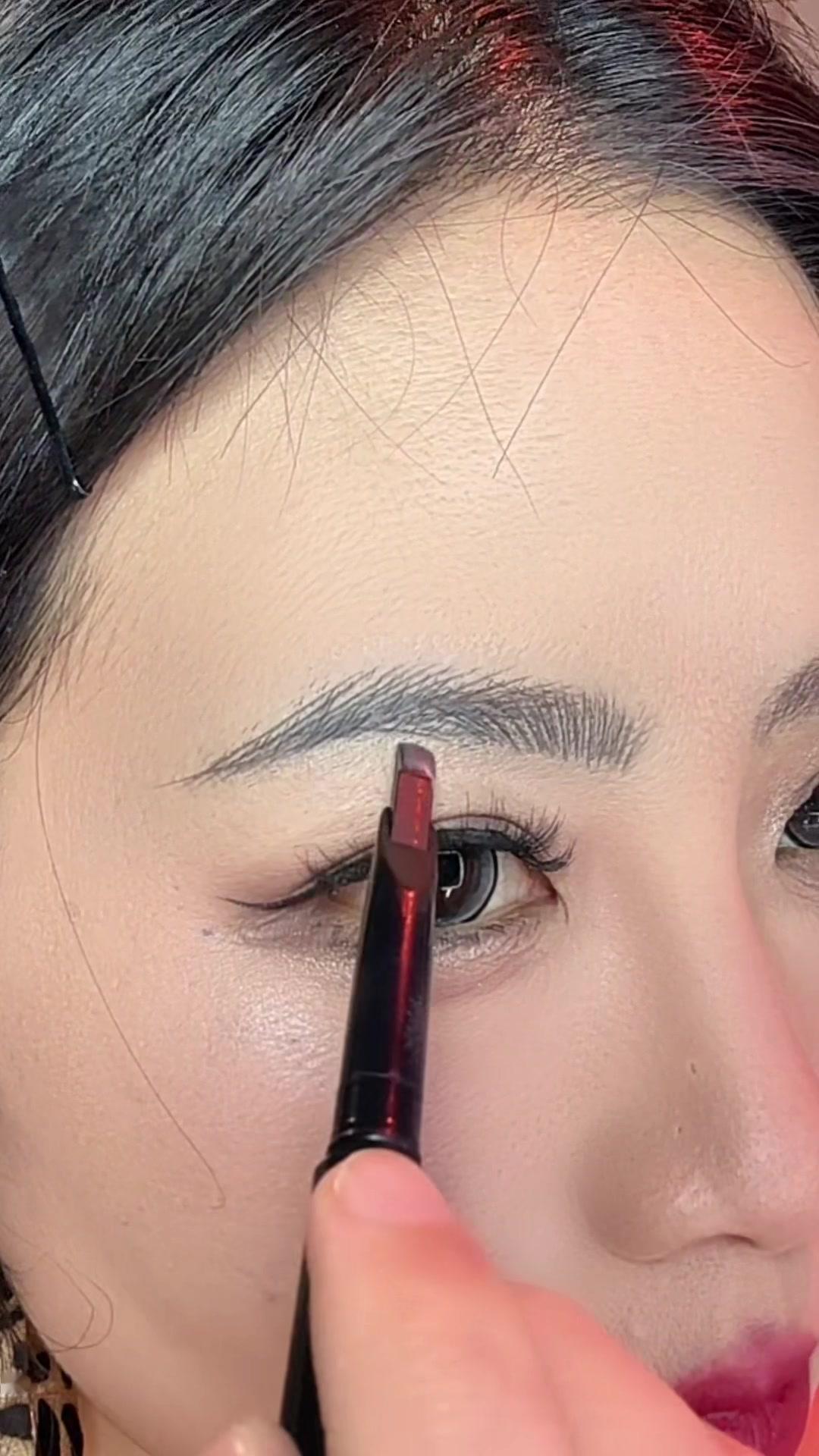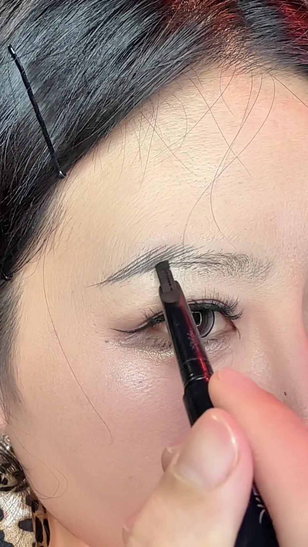 先找到瞳孔正上方,这里是眉毛中心线,从这里往眉尾画一条弧线,三点定眉尾。眼白中心处往上找眉峰,用眉笔芯宽度作高度参考,找准后以这条斜线条为导向线,从上往下一笔一笔画,直到和眉头相交处,倒下去加一点点雾面过渡。 第二步,从内眼角直直往上推找眉头位置,左边画五六条斜线条,一条比一条短;右边画两三条。然后在每两条眉毛之间加细绒毛,顺着最后一条斜线条往上推,一直到眉尾,这样眉毛的毛流感就出来了~ 最后把眉毛中间颜色加深一点,更显浓密流畅,整个效果又自然又野生,完全不会假!