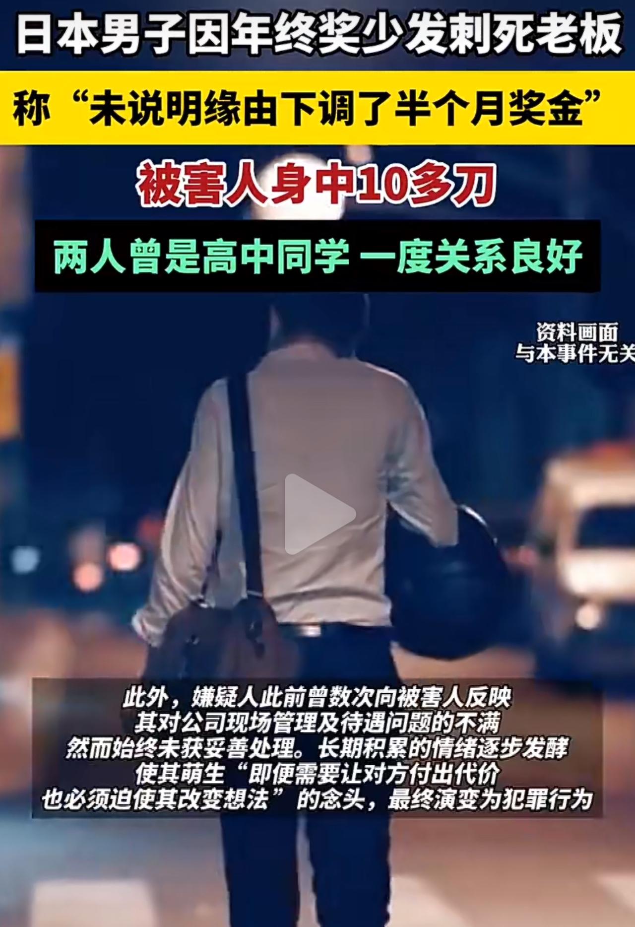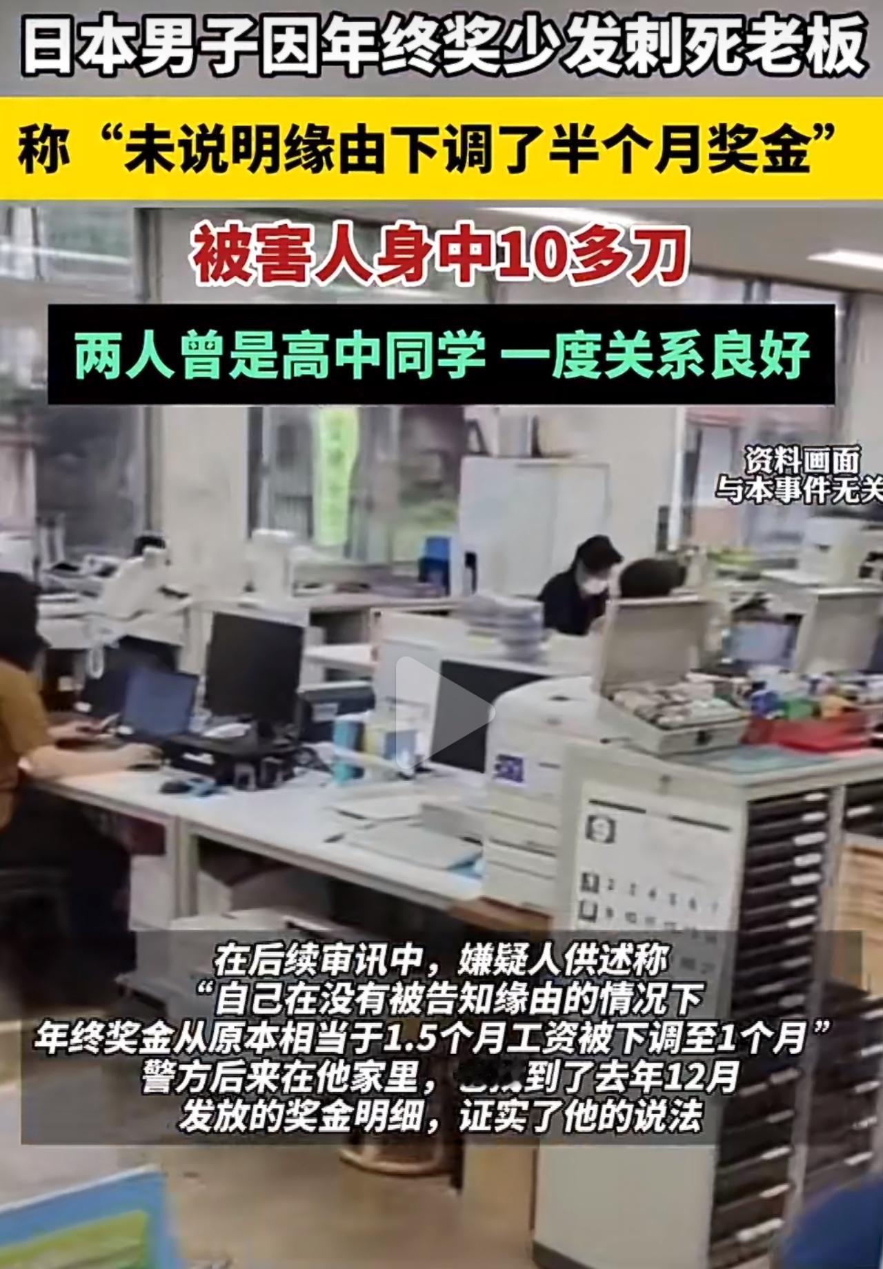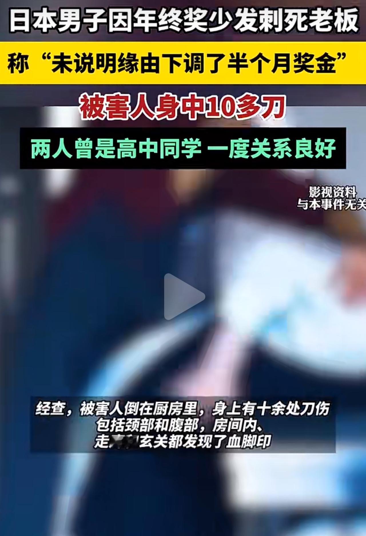 就因为年终奖少给了半个月工资,居然把高中同学老板给杀了?!45岁的山中正裕,对着44岁的社长河岛明宏捅了十几刀,东京大田区那间公寓里,血脚印从厨房一路拖到玄关,这事儿听着都让人后脊梁骨发凉! 俩人当年关系多铁啊,四年前河岛主动喊山中来自己公司,连山中结婚他都亲自到场道贺。山中也没辜负信任,一路干到营业部长,勤勤恳恳没怨言。可2025年底一看年终奖明细,直接懵了——往年都是1.5个月工资,今年硬生生砍到1个月,问老板要说法,连句正经解释都没有。 他前前后后找了好几次,每次都被敷衍过去,心里的憋屈像堵了块石头,越积越沉,最后那点同窗情分全磨没了,满脑子就剩“得让他付出代价”的念头。 好好的厨房变成了凶案现场,曾经的好朋友倒在血泊里,十几年的情谊,全毁在刀光血影里。网友都说“职场人太懂这种委屈”,可再气也不能碰法律红线啊!日本又不是没地方说理,劳动仲裁、工会协商都能维权,偏偏选了最极端的路。 中年人的职场哪有容易二字?现在终身雇佣制早不顶用了,一份工作就是全家的生计。但奖金少发再窝火,也不能让火气冲昏头。老板一句“没理由”,看似简单,堵死的是员工的沟通路,也可能逼走了人的活路。 职场矛盾哪是“你死我活”的事儿?老板多一分透明,员工找对维权的门道,这悲剧本来能避免。两条人命、两个破碎的家,说到底就一句话:再大的委屈,也不能拿生命赌输赢!日本杀人案 日本年终奖 日本公司奖金