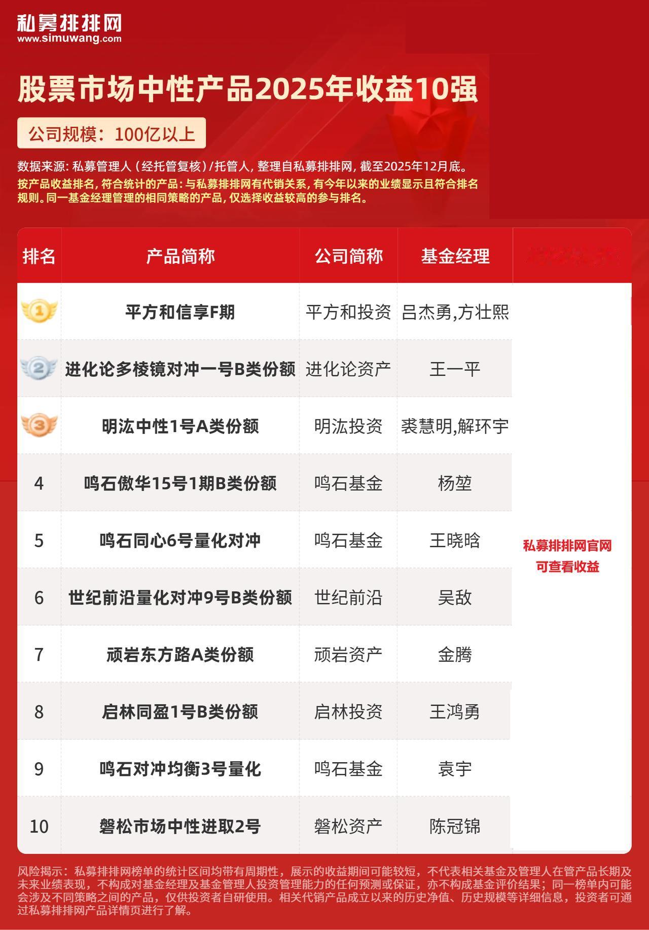 百亿私募业绩TOP10(股票市场中性策略) 点击查看完整私募业绩: 股票市场中性的核心目标是消除股票市场整体波动(系统性风险)对投资组合的影响,从而追求与市场涨跌无关的绝对收益。 简单来说,这是一种“不靠市场上涨赚钱”的策略。 无论大盘是涨是跌,它都力求通过选股能力或其他Alpha因子来获得正收益。 1、平方和信享F期 由平方和投资的基金经理吕杰勇、方壮熙管理,平方和投资是百亿级量化私募,吕杰勇作为公司创始合伙人,拥有北京大学数学学士、计算机硕士背景,曾任职于搜狐、腾讯、博时基金等机构,在量化策略研发领域经验深厚,方壮熙协同参与策略优化,共同深耕股票市场中性赛道。 2、进化论多棱镜对冲一号B类份额 由进化论资产的基金经理王一平管理,王一平是进化论资产创始人,早年从主观投资转型量化,提出“有逻辑的量化”理念,带领团队在股票市场中性策略中融合基本面逻辑与量化模型。 3、明汯中性1号A类份额 由明汯投资管理,明汯投资是专注量化策略的百亿私募,公司深耕量化投研领域,擅长通过多因子模型与对冲工具构建股票市场中性组合,在风险控制与收益获取上具备较强平衡能力。 4、鸣石傲华15号1期B类份额 由鸣石基金的基金经理杨堃管理,鸣石基金是国内头部量化私募,在股票市场中性策略领域布局深入,杨堃作为核心投研成员,专注量化对冲模型的迭代优化,助力产品在震荡市中以期实现长期收益。 5、鸣石同心6号量化对冲 由鸣石基金的基金经理王晓晗管理,鸣石基金凭借成熟的量化投研体系在市场中性赛道占据优势,王晓晗擅长结合市场波动调整对冲策略参数,提升产品收益的稳定性与可持续性。 6、世纪前沿量化对冲9号B类份额 由世纪前沿的基金经理吴敌管理,世纪前沿是百亿级量化私募,聚焦股票量化策略布局,吴敌主导的市场中性产品,依托公司的因子挖掘与算力支持,在同类策略中表现突出。 7、顽岩东方路A类份额 由顽岩资产的基金经理金腾管理,顽岩资产是专注量化投资的百亿私募,金腾深耕股票市场中性策略领域,擅长通过精细化的风险对冲与标的筛选。 8、启林同盈1号B类份额 由启林投资的基金经理王鸿勇管理,启林投资是国内头部量化私募,在股票市场中性策略上具备成熟的投研框架,王鸿勇作为核心基金经理,专注策略的落地与优化。 私募排排网私募私募基金私募那些事私募产品明汯投资平方和投资进化论资产鸣石基金高频交易起家的世纪前沿是一家什么样的机构?启林投资顽岩资产今日A股私募公司股票交流股票财经A股市场