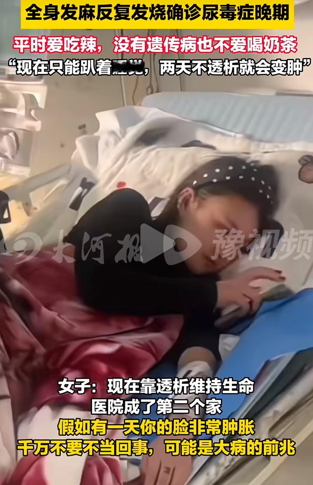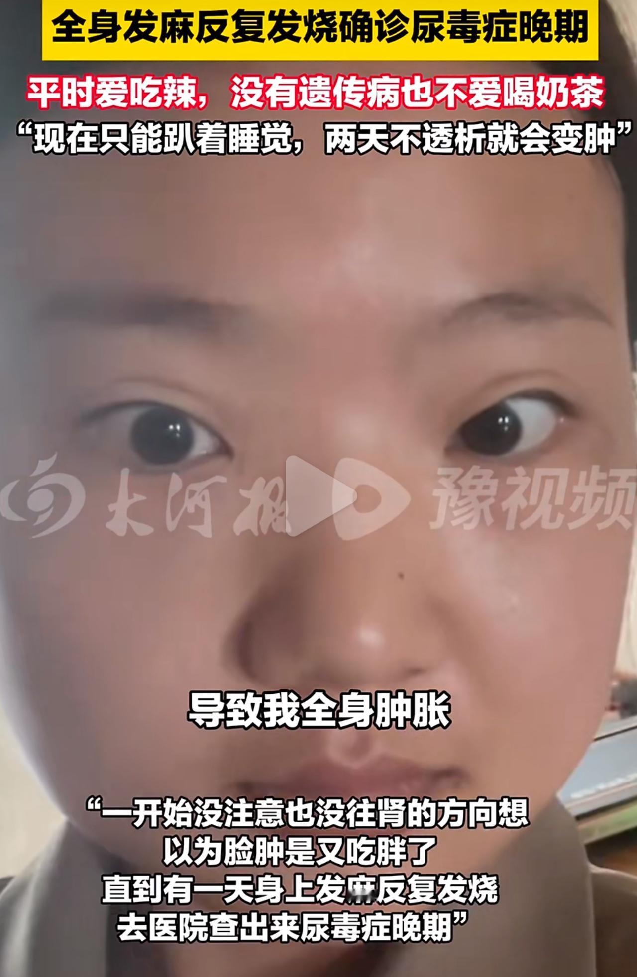 24岁姑娘半年狂减50斤,结果查出尿毒症晚期。这姑娘2025年中旬,半年时间从102斤飙到160斤,脸和眼皮天天肿得老高,她愣是当成自己吃胖了,压根没往生病上琢磨。她不爱喝奶茶,也没遗传病,就是特别爱吃重辣高盐的东西,把肾病引起的水肿当成普通肥胖,转头就搞极端节食,半年硬生生减了50斤,医生说每周减1-2斤才安全,她这速度快得没边儿了! 减肥那阵子,她老反复低烧,浑身还发麻,可她满脑子就想着赶紧瘦下来,竟觉得这都是减肥该有的正常反应,硬生生扛着没去医院检查。直到2026年1月,她憋得喘不上气,全身肿得厉害,才去检查,结果血肌酐飙到1400多μmol/L,是正常值的14倍还多,直接确诊尿毒症晚期。现在每周得去透3次析,连喝口水都要严格限量,这辈子都离不开透析机了。 好多人都跟她一个德性,早上起来眼泡肿得跟泡发的馒头似的,一按一个坑半天弹不回来,明明是肾病闹的水肿,愣是傻乎乎当成自己吃胖了!压根不知道普通肥胖按一下秒回弹,肾病的肿却半天消不了,体重还会短时间内往上涨。现在肾病越来越偏向年轻人,吃的太咸、熬夜、瞎减肥都是诱因,可年轻人总觉得自己身体棒,把这些不对劲的信号全归结成熬夜、压力大,根本不当回事! 费了那么大劲减肥,最后却赔上了一辈子的健康,这教训也太惨痛了!千万别再把水肿当成胖了,每年花几十块钱做个尿常规,真花不了多少事儿。身体给出的异常信号,从来都不能硬扛,该去检查就得赶紧去啊!尿毒症 尿毒症肾衰 慢性肾病晚期