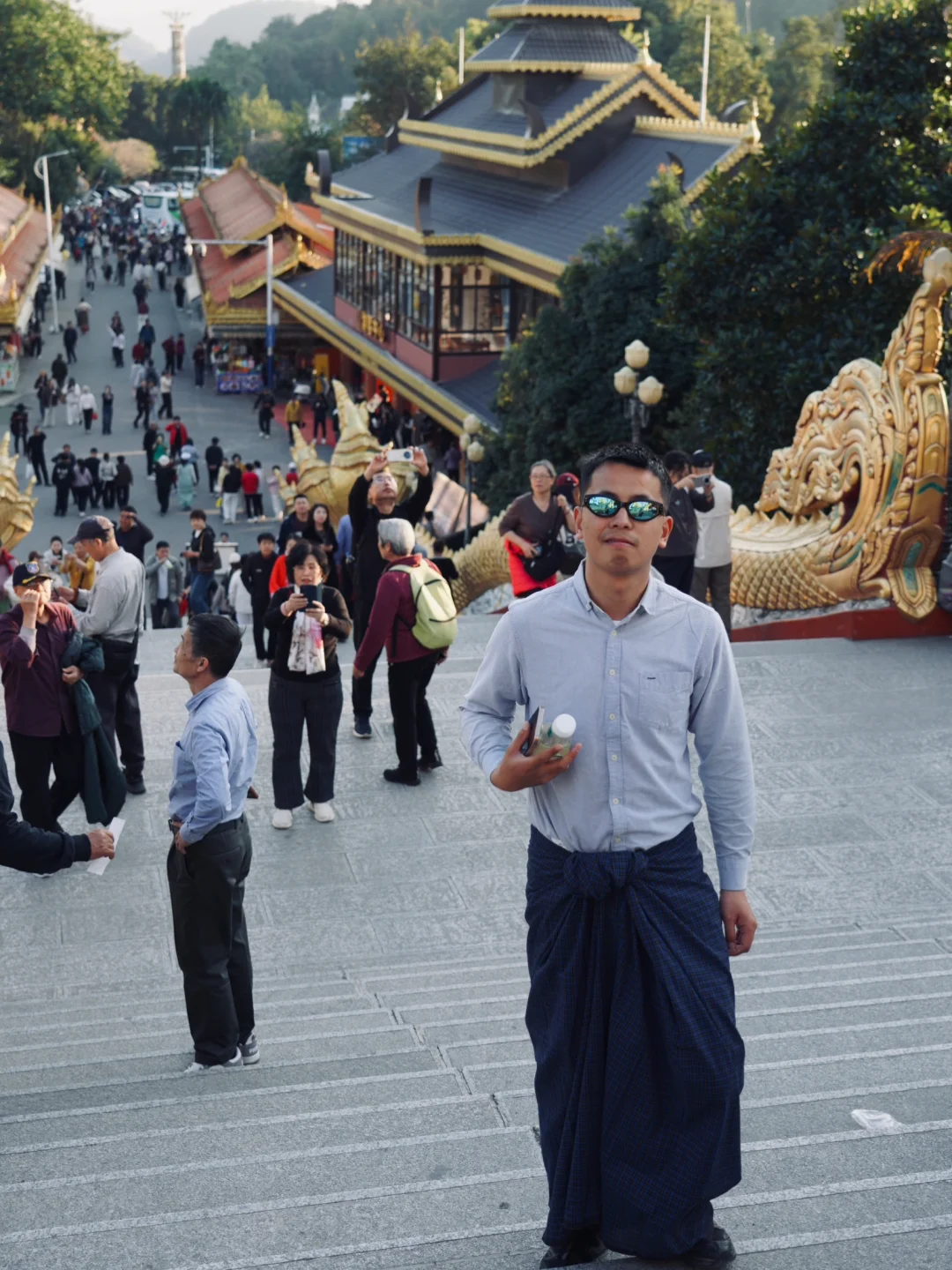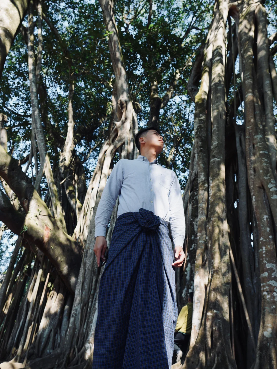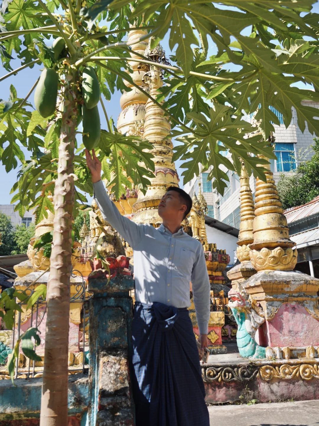 男生来芒市一定要试试穿隆基。 隆基是缅甸男士传统服装,《边水往事》中,猜叔的日常穿着就是隆基,穿上这条布裙在芒市可以拍出边水的故事感。 [向右R]在哪里可以买:丙午街服装城,傣装店基本都有,价格30-60不等,需要自己砍价。建议买素色的,男款越素越出片。 [向右R]最佳拍照机位: 1. 勐焕大金塔 2. 佛光寺 3. 松树寨 4. 上井坎榕树王 5. 古牛缅甸餐厅