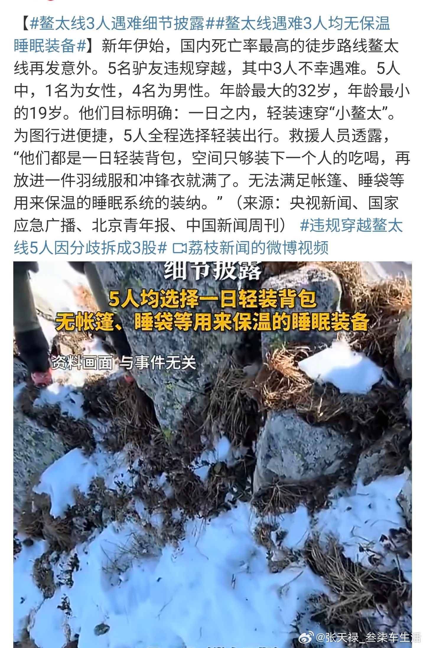 鳌太线3人遇难细节披露轻装穿越地形复杂、天气多变的鳌太线,而且还是冬季,是不是太过于自信了。领队也没有多少爬山的经验吧,这种线路不做好充足准备,这不是在开玩笑吗?敬畏大自然,拒绝非法穿越