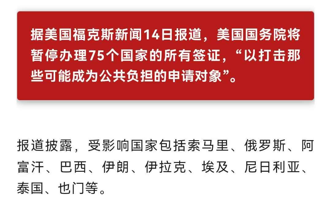 美国暂停对75个国家移民签证,有人说这是针对中国的“选边站”,简直是扯淡 新华社消息,美国自2026年1月21日起暂停对75个国家的移民签证申请,以评估申请人是否可能成为“公共负担”,但旅游、学生等短期签证不受影响。受影响的国家包括俄罗斯、巴西、尼日利亚、伊朗、埃及、泰国等。 有人发文称,这些受影响的国家都是中国的朋友,是“一带一路”成员国,美国这么干就是告诉全世界:谁加入“一带一路”就是和美国对着干,美国就不给他办移民签证。美国这是逼着全世界“选边站”。 这简直是扯淡。 美国暂停移民签证申请,和中国没有任何关系,与“一带一路”更没有关系。联合国有193个成员国,加入“一带一路”的有156个,可以大部分国家都是加入一带一路的。如果将“加入一带一路”与“美国签证受限”联系起来,是别有用心的,是制造焦虑和阵营对抗。