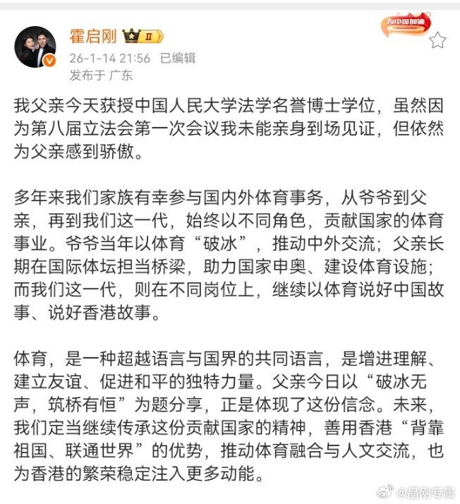 霍启刚发文祝贺父亲霍启刚为父亲感到骄傲恭喜霍老!1月14日,在中国人民大学深圳研究院前海院区,中国香港体育协会暨奥林匹克委员会会长、国际奥委会名誉委员、霍英东集团主席霍震霆先生,获授中国人民大学法学名誉博士学位。