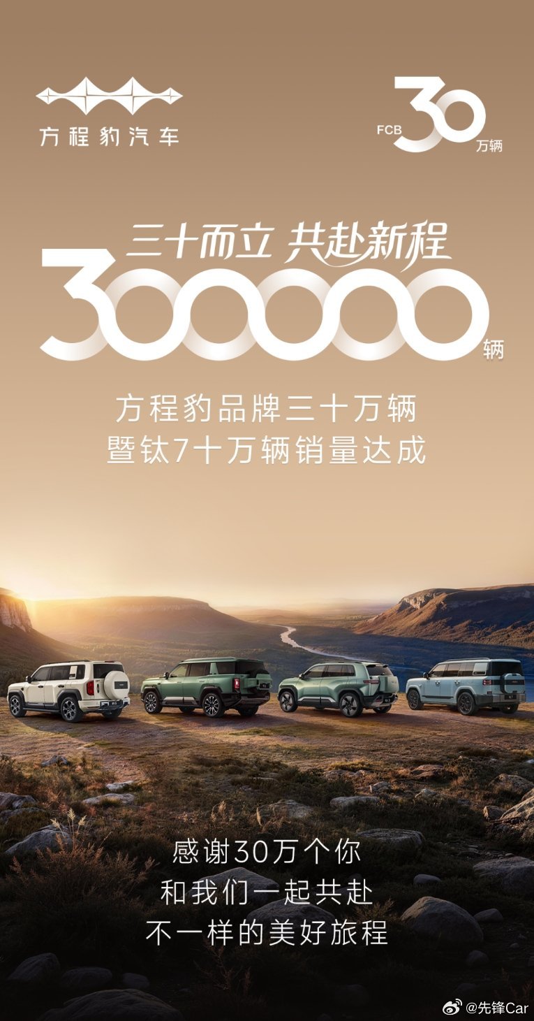 三十而立·共赴新程 方程豹销量增速快方程豹 品牌三十万辆销量达成 钛7 十万辆销量达成仅用时82天,方程豹便实现了从20万辆到30万辆的销量跃升 方程豹新势力品牌增速第一