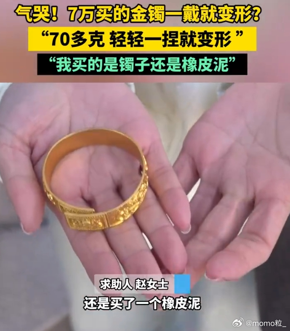 女子7万买金镯一捏就变形 两个字想“白嫖” ,想换款 ,不想出折旧费和工费自己要买这种款式,其实买个实心的素圈,也没这么软