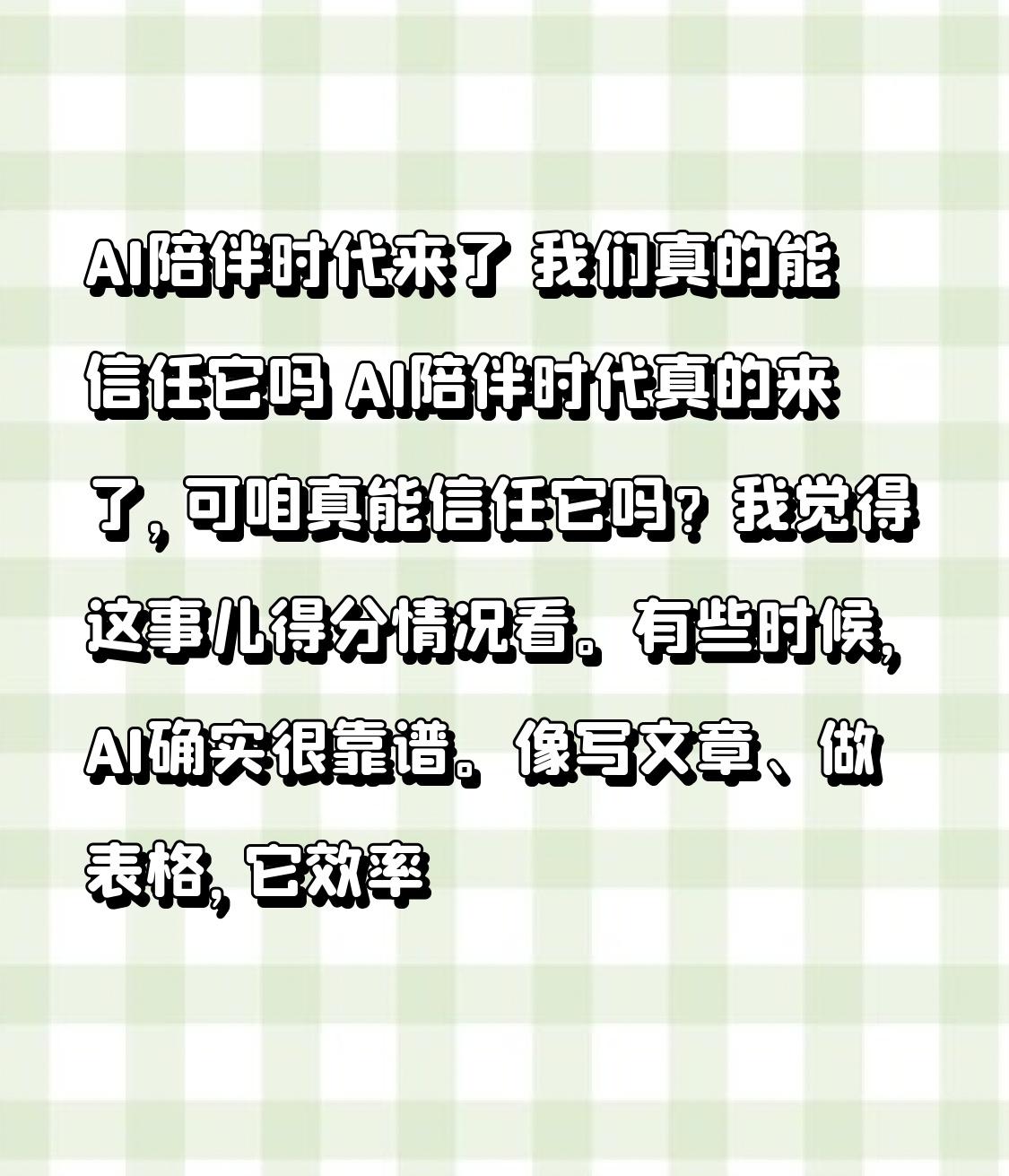 AI陪伴时代来了 我们真的能信任它吗 AI陪伴时代真的来了,可咱真能信任它吗?我觉得这事儿得分情况看。 有些时候,AI确实很靠谱。像写文章、做表格,它效率高得惊人,能快速给出准确的答案和建议。但AI也有不靠谱的时候,它可能会生成一些错误或误导性的内容。之前就有新闻报道,AI给出的医疗建议差点耽误患者病情。 所以,AI可以是好帮手,但不能全信。我们得保持理性和批判性思维,用自己的智慧去判断它说的对不对,让AI成为辅助,而不是主宰。