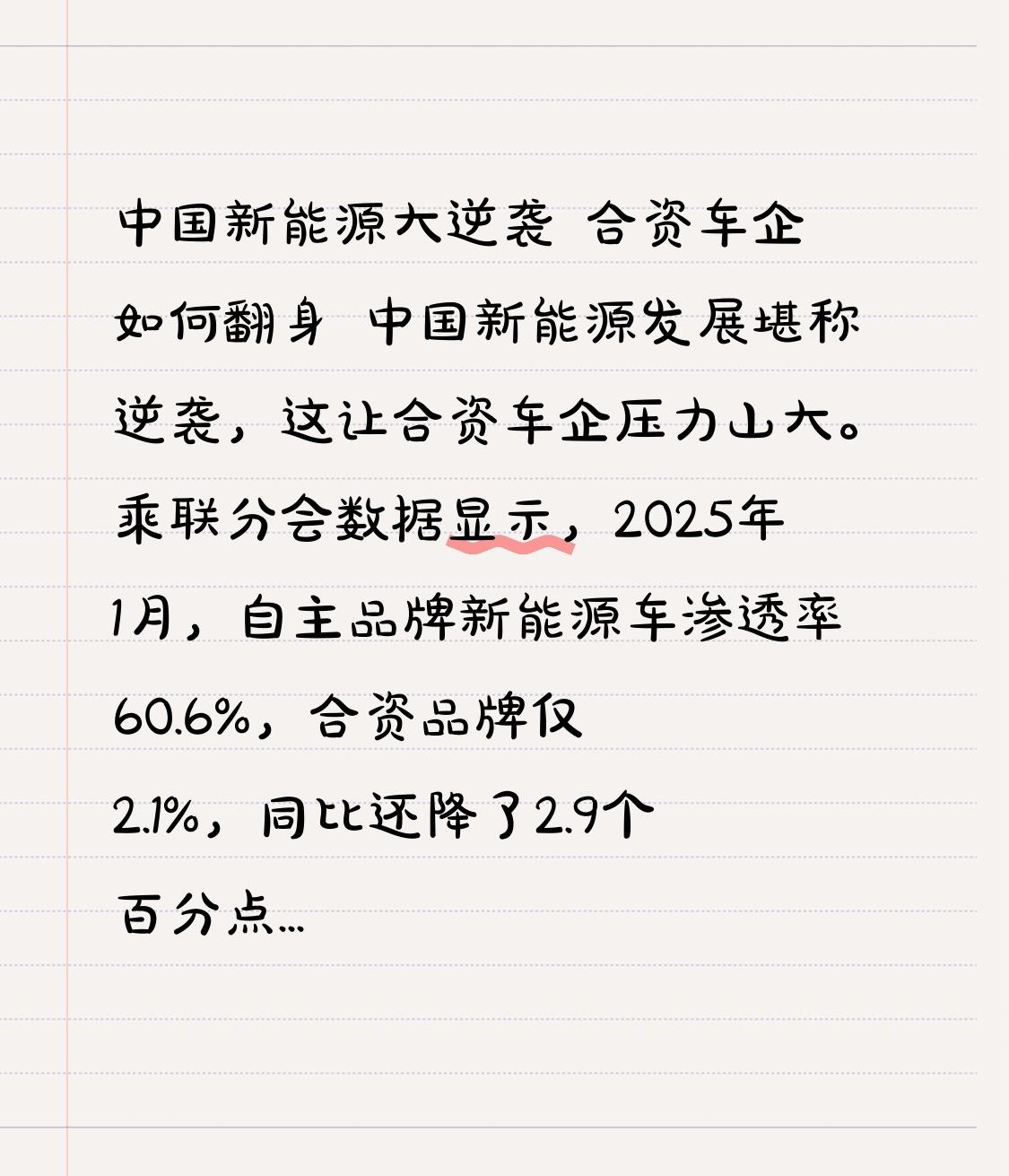 中国新能源大逆袭 合资车企如何翻身 中国新能源发展堪称逆袭,这让合资车企压力山大。乘联分会数据显示,2025年1月,自主品牌新能源车渗透率60.6%,合资品牌仅2.1%,同比还降了2.9个百分点。不过也有合资新能源表现亮眼,像丰田铂智3X月销破万,累计超5.2万辆;日产N7不仅月销破万,还常拿周上险量第一,累计超3.2万辆。它们翻身的关键,一是找了好队友,借助中方技术,开发周期缩短40%;二是足够便宜,供应链本土化率高,像铂智3X达99%。如今高阶智驾重塑格局,合资车企也在加快智驾上车,靠差异化突围,未来胜负还不好说。