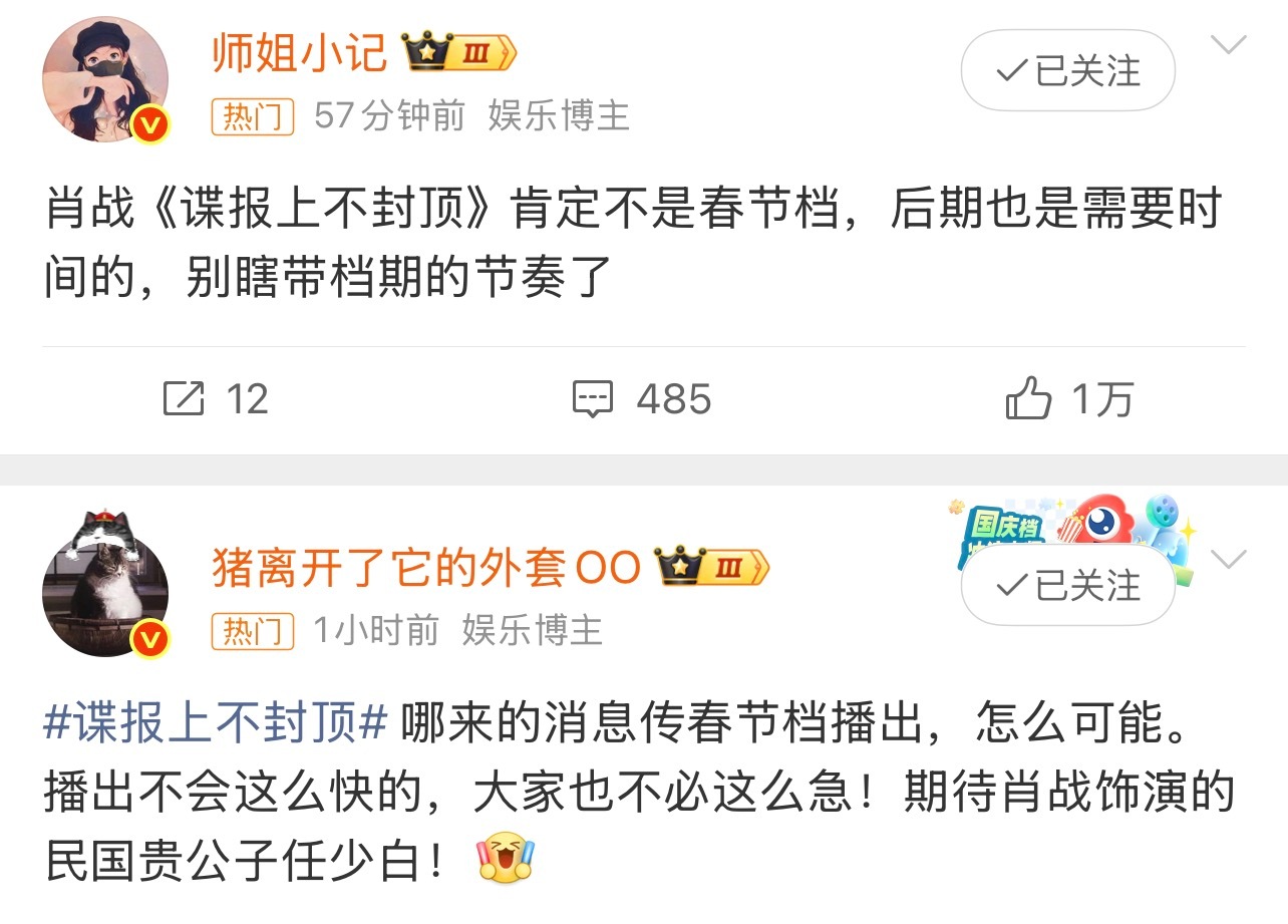 谍报上不封顶网传播出消息是假的,多个博主辟谣看来是剧方急了好剧不怕晚,后期一定要做好,凡是肖战个人戏份超过85%的剧,大家都特别爱看,所以正午的剪辑老师好好剪!