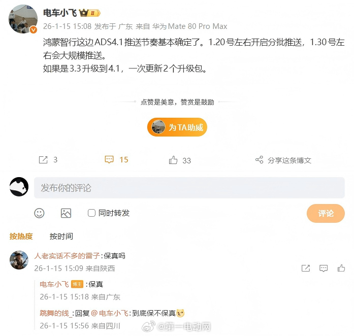 华为乾崑智驾博主透露华为ADS4.1也要推了:从1月20日起,华为将开始分批推