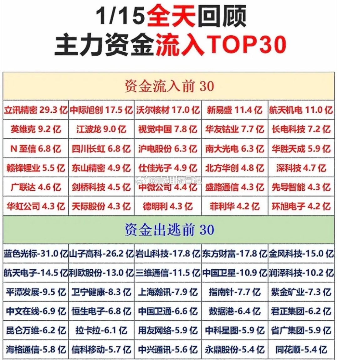 1/15 主力资金流入流出TOP30,揭秘市场动向!主力资金流向两极分化:立讯精密等30股获大额流入,蓝色光标等30股遭抛售,市场分歧明显。