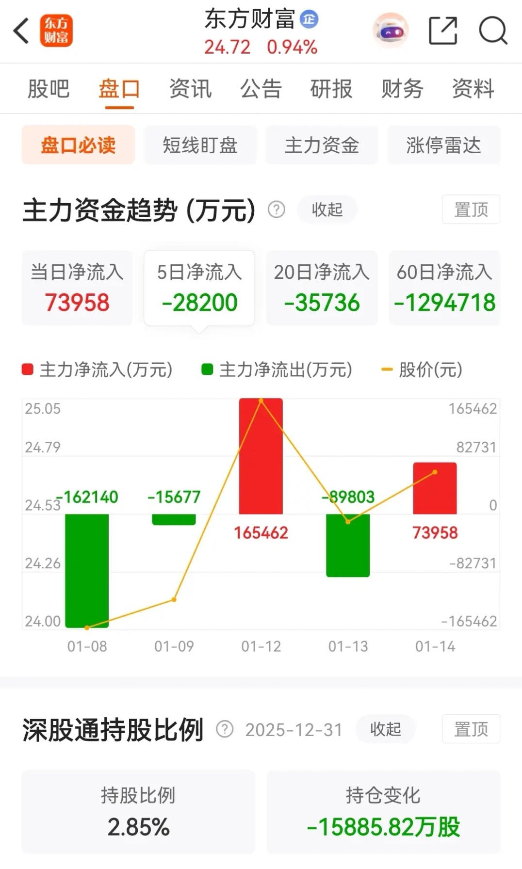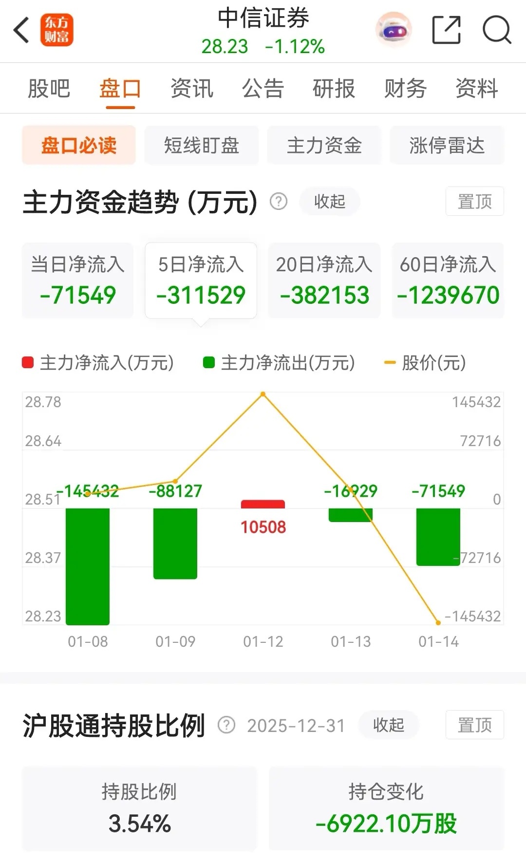 东方财富和中信证券今天的走势完全相反,东方财富低开后冲高回落,红盘报收,被主力资金大幅净买入;而中信证券同样也是低开后冲高回落,最终绿盘报收,且被主力资金大幅净卖出。券茅东方财富今天虽然盘中跳水,但最终依然收涨0.94%,收盘报价为24.72元,全天的成交金额为234.90亿元,也是放出了巨量。在资金流向上,今天被主力资金大幅净买入了7.3958亿元,近五个交易日则是被主力资金合计净卖出了2.82亿元。券商一哥中信证券今天午后跳水后一路下泻,几乎就是以最低价报收,收盘时跌了1.12%,收盘报价为28.23元。在资金流向上,今天被主力资金大幅净卖出了7.1549亿元,近五个交易日则是被主力资金合计净卖出了【31.1529亿元】。从走势上看,自从1月7日尾盘大额卖单压盘之后,一直都处于破位下行态势之中。至于更详细的技术分析,可以查看上一篇中关于券商概念板块今天的走势分析。对于二者的后续走势,需要注意政策调控导致的股价与业绩背离。