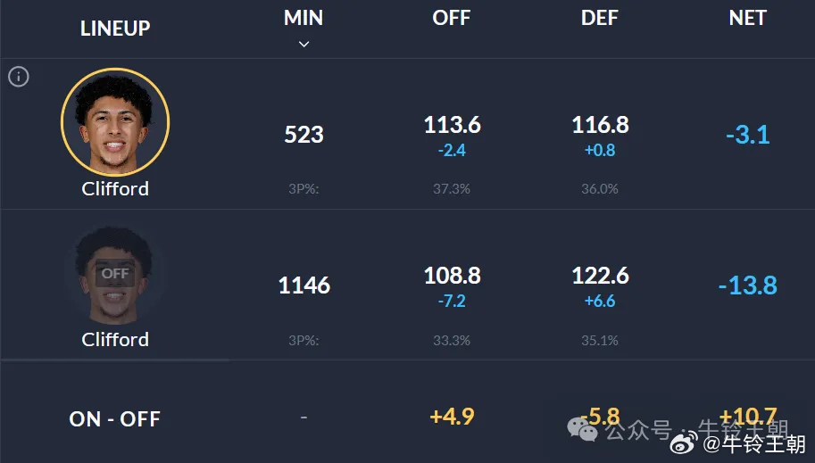 雷诺近10场比赛表现相比刚刚坐上首发有些许下降,数据来到11.3+7.8,但是命中率提升了,失误下降了,同时在时间下降的情况下,场上的跑动距离依然是队内前三的水平,有些撞墙但不严重。雷诺依然是一个智商极高的人,他还在持续学习和吸收,虽然他的对抗依然不太好,但他还是敢于对抗,敢于换防外线,利用身高的优势还是有一定的护框效果,打独行侠对AD的防守是令人满意的。而克利福德和卡德维尔,在防守端依然提供极好的贡献,他们是国王on/off净效率值最高的两个人。克利福德的单防能力和卡德维尔的篮板能力,都是对球队的巨大补充。萨克拉门托国王
