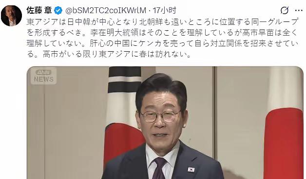 送走李在明后,高市早苗还没回味完这次日韩交流,她就被骂的“狗血淋头”。日本著名时政评论员佐藤章今天说:东亚地区应以中日韩三国为核心,同时将地理位置虽远但同属一个区域的朝鲜也纳入其中,共同构建区域合作框架。韩国总统李在明理解这一点,并为之付出努力。但日本首相高市早苗目光短浅,完全无法理解。只要高市这种主动挑衅邻居、招致对立关系的领导人继续执政,东亚就不会迎来和平繁荣的 “春天”。 佐藤章的炮轰像一面照妖镜,直接照出了高市早苗外交策略的致命伤——用19世纪的思维处理21世纪的区域合作。当李在明在奈良会谈中主动提及“韩中日三国合作”时,高市却像复读机般重复了四次“韩美日合作”,这种对话的错位感仿佛两个人分别拿着地图和星图在指路。 高市的政治基因里刻着“对抗性依存”的密码。她与安倍晋三的政治同盟关系,本质上是一种依靠制造外部敌人来巩固内部支持的策略。这种玩法在冷战时期或许有效,但在全球供应链深度交融的今天,强行割裂邻国关系等于给自己的经济命脉打上死结。当日本汽车业72%的稀土依赖中国供应时,高市团队却把中方出口管制措施解读为“摆脱对华依赖的机会”,这种脱离现实的幻想比科幻小说更魔幻。 李在明的务实主义路线反而成了照出高市短视的镜子。韩国总统府近期将东亚三国表述顺序正式定为“韩中日”,看似只是文字游戏,实则是外交重心调整的信号。这种排序把韩国放在引领位置,中国作为核心伙伴,日本则成为合作对象,与高市死守的“韩美日”框架形成鲜明对比。更讽刺的是,李在明在保守派大本营《东亚日报》的采访中强调“寻找最大共同点”,而高市却在进步派媒体面前大谈制衡——这种角色错位反映出东北亚政治光谱正在重新调色。 独岛争议的定时炸弹被高市亲手引爆。今年10月日方以韩国军机在独岛训练为由拒绝加油支援,导致韩方取消参加日本“自卫队音乐节”;11月韩日联合搜救演习也叫停。这些连锁反应验证了佐藤章的警告:高市团队信奉的“韩国越是被打压就越听话”的殖民心态,正在把两国几十年积累的互信一点点烧成灰烬。 更深层的危机在于代际认知的断裂。当韩国庆尚北道教育厅声明强调“历史与领土问题会直接影响未来世代的认知与价值观”时,高市却还在用岛根县“竹岛日”这类象征性动作刺激邻国神经。这种时空错位的对话,就像用拨号上网的速度尝试加载5G视频——除了卡顿和死机,很难有第二种结果。 佐藤章点破的关键问题在于区域合作主导权的争夺。他主张的“中日韩+朝鲜”框架本质上是去美国化的区域自治蓝图,而高市坚持的“韩美日”则是典型的安全依附模式。这两种路线的碰撞背后,是日本究竟要当美国亚太战略的马前卒,还是成为东亚命运共同体的建设者的终极选择题。 现实给高市的政治豪赌亮起了红灯。选择在1月23日解散众议院,表面是趁支持率尚未暴跌先发制人,实则是逃避国会审议的临阵脱逃。当在野党准备追究其涉台言论引发的经济反噬、“统一教”关联及政治资金问题时,高市选择用选举烟雾弹掩盖执政无能——这种套路在信息透明的社交媒体时代,注定会引发更强烈的反噬。 东亚的春天从来不是某个国家能单独解锁的季节。当中国通过稀土管制展示经济武器的精准打击力,韩国用表述顺序调整重构外交优先级,朝鲜以导弹试射刷存在感时,高市却还在幻想用“价值观外交”当保鲜膜来封存日本的主导权。这种逆流而动的挣扎,最终只会让日本在历史洪流中搁浅。 各位读者你们怎么看?欢迎在评论区讨论。