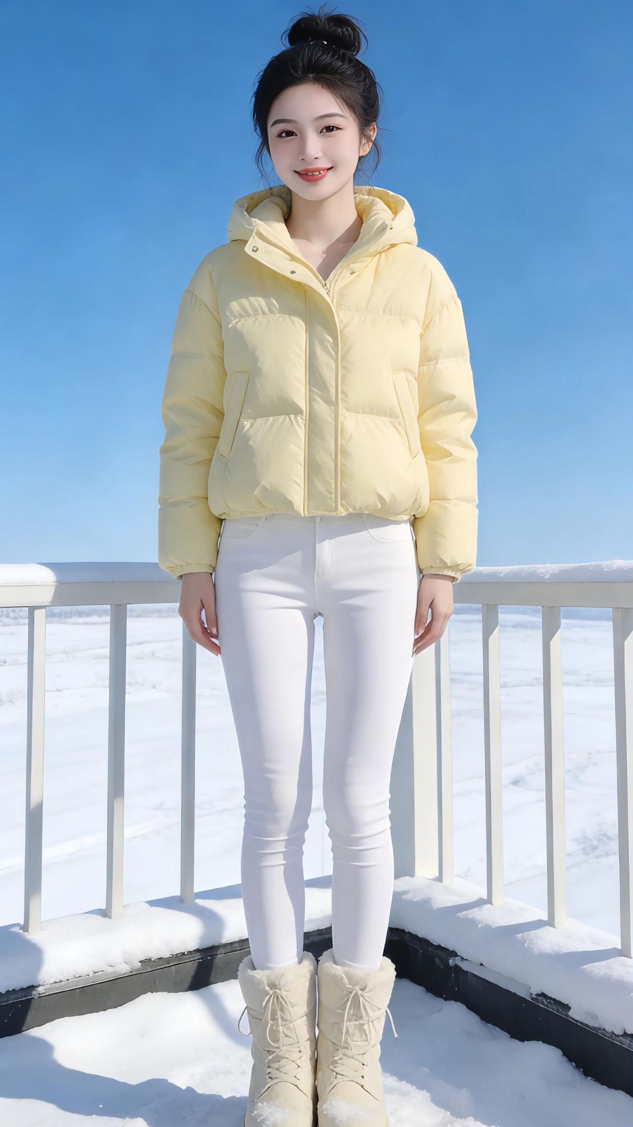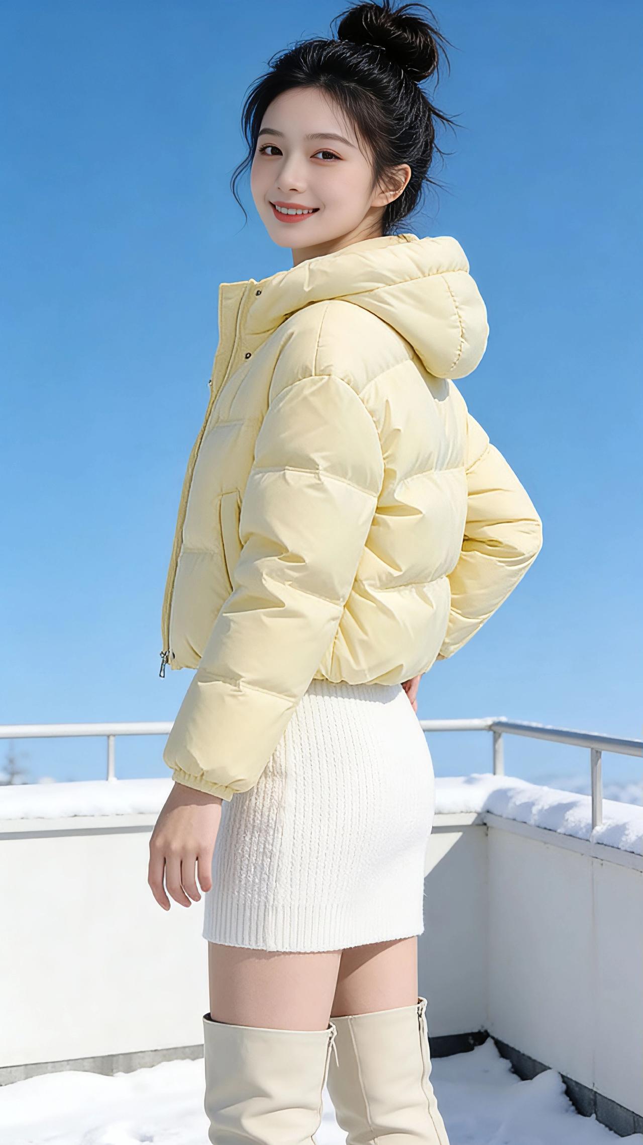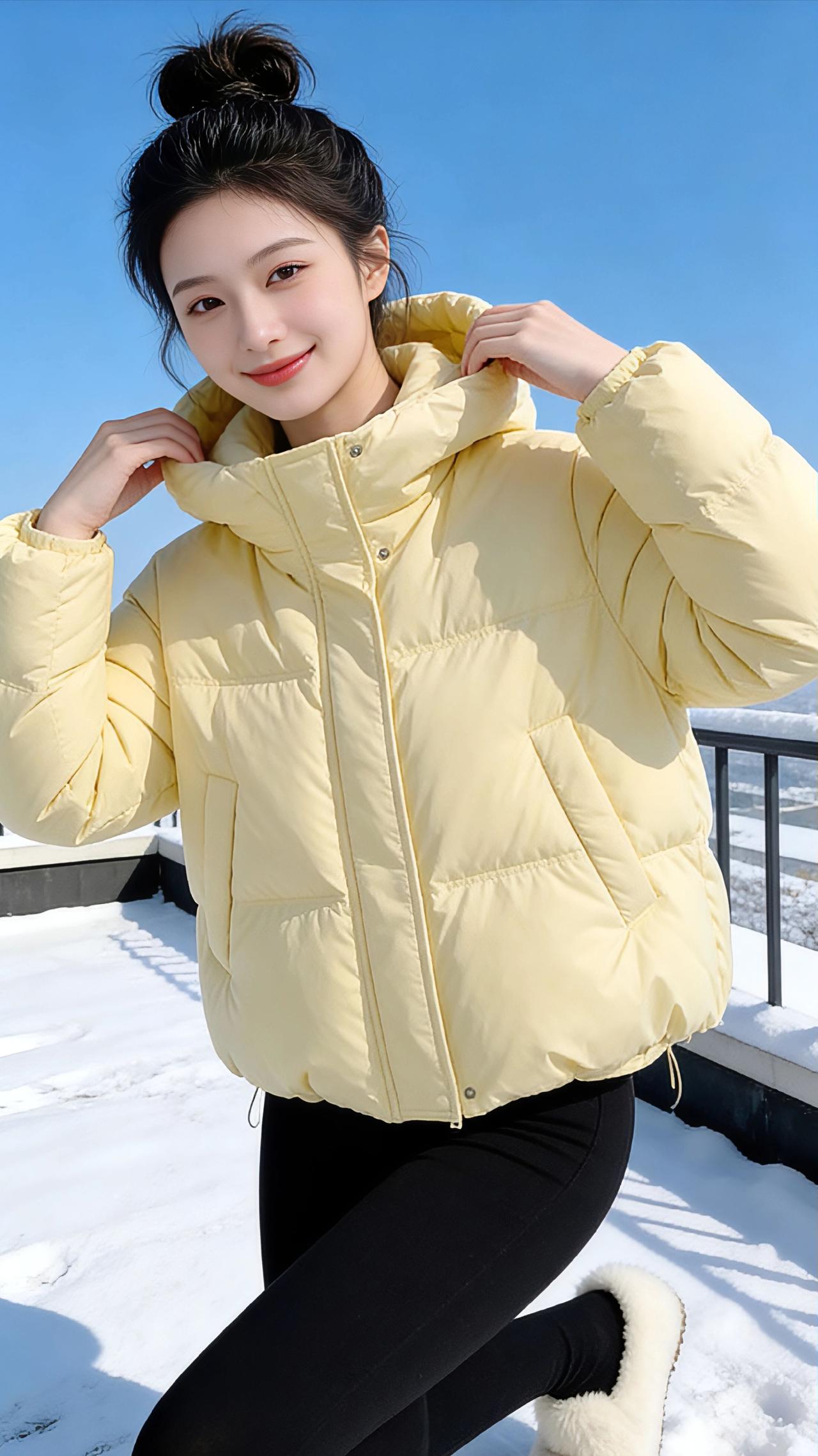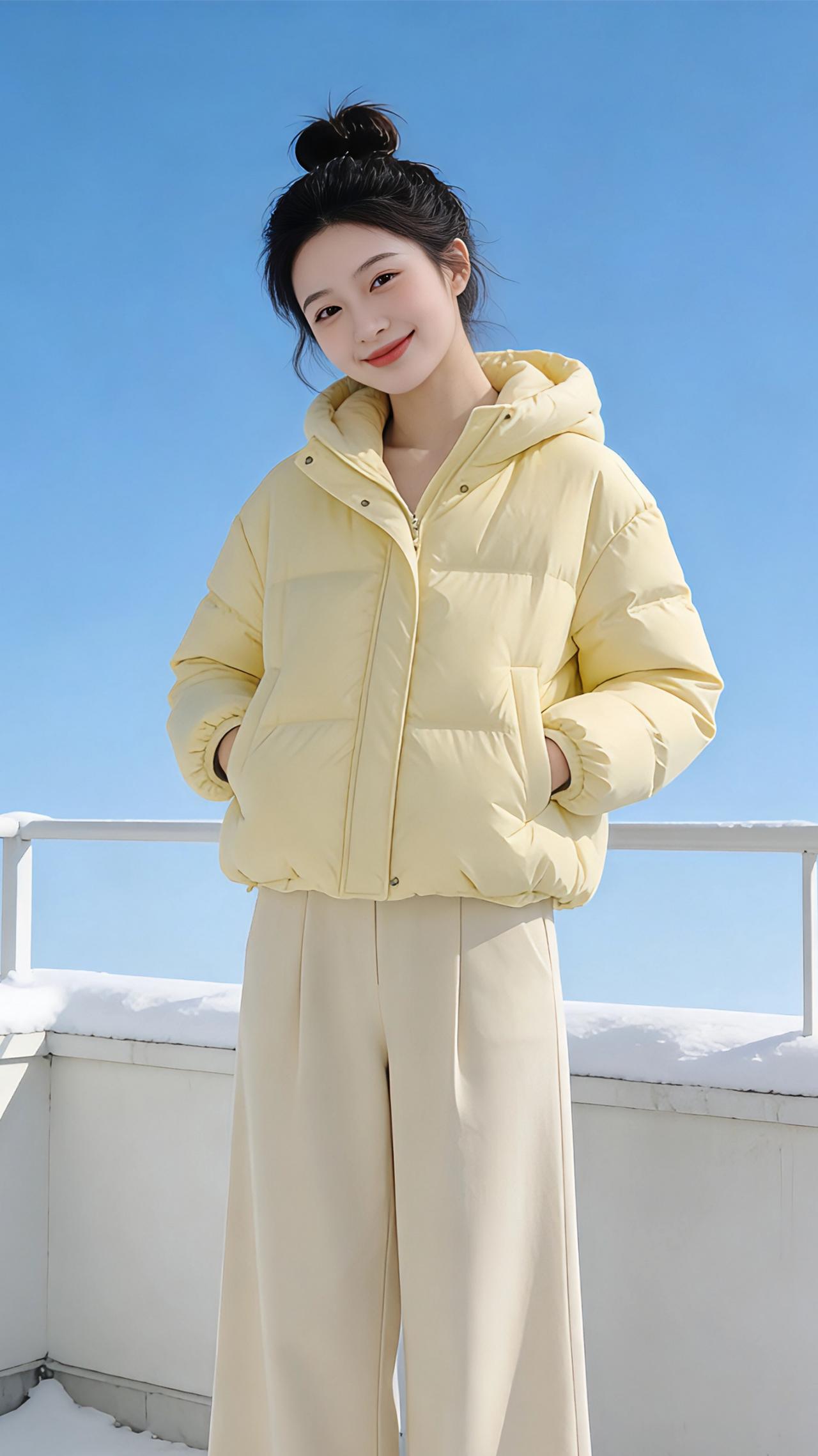 雪色里的嫩黄 冬日的雪裹着露台的栏杆,天地间是洗练的蓝与白,像被冻住的澄澈晴空,连风都带着细碎的冰晶,刮过耳畔时凉丝丝的,却又被身上嫩黄色的羽绒服揉碎了寒意。 那抹黄是冬日里偷来的春日,像刚冒头的迎春花苞,软软地鼓在肩头,连帽沿的弧度都带着温软的甜。手揣进羽绒服口袋的瞬间,暖意漫上来,便敢迎着雪风站定,任蓬松的衣料将身形裹成一团温柔的云。指尖勾着帽绳轻扯,绒面的软腻蹭过指腹,低头时看见雪地映着衣摆的黄,像在素白的宣纸上晕开了一滴蜜色的墨。 转身时衣料轻响,配着白色针织裙,嫩黄就成了雪地里最鲜活的注脚;换了浅灰运动裤,又添了几分随性的俏皮,抬脚时羽绒服的下摆轻轻晃,像振翅的小黄雀,要从这片雪色里飞出去。手臂张开的刹那,蓝空成了背景板,嫩黄的衣袂与雪风相拥,才发觉冬日从不是只有冷寂,一件暖融融的鹅黄羽绒服,就能把漫天风雪,都酿成裹着甜的温柔。 高级感穿搭 冬季穿搭 新年穿搭 棉衣棉服