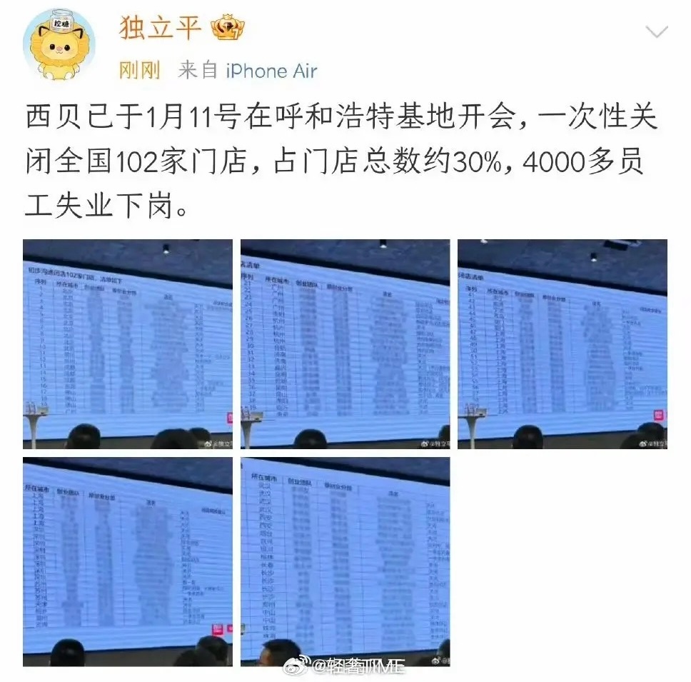 西贝将关闭102家门店根据最新公开信息,西贝餐饮确认将关闭全国102家门店,主要集中在一二线城市。目前官方尚未公布完整门店清单,但部分城市的闭店情况已被媒体披露:一、已确认的闭店城市及数量 上海:19家(如宝山万达店已确认闭店) 北京:10家 深圳:8家 广州:5家 杭州、武汉、长沙:各4家 成都、佛山、昆明、苏州:各3家 东莞、贵阳、合肥等:单城1-2家不等 (合计已披露约66家,剩余36家分布于其他城市) 二、部分具体闭店门店 苏州繁花中心店 北京石景山京西珠宝城店 汕头万象城店 南京六合欢乐港店 深圳西丽万科云城店 长沙富兴时代店 重庆观音桥店 (以上门店均显示为“歇业关闭”状态)