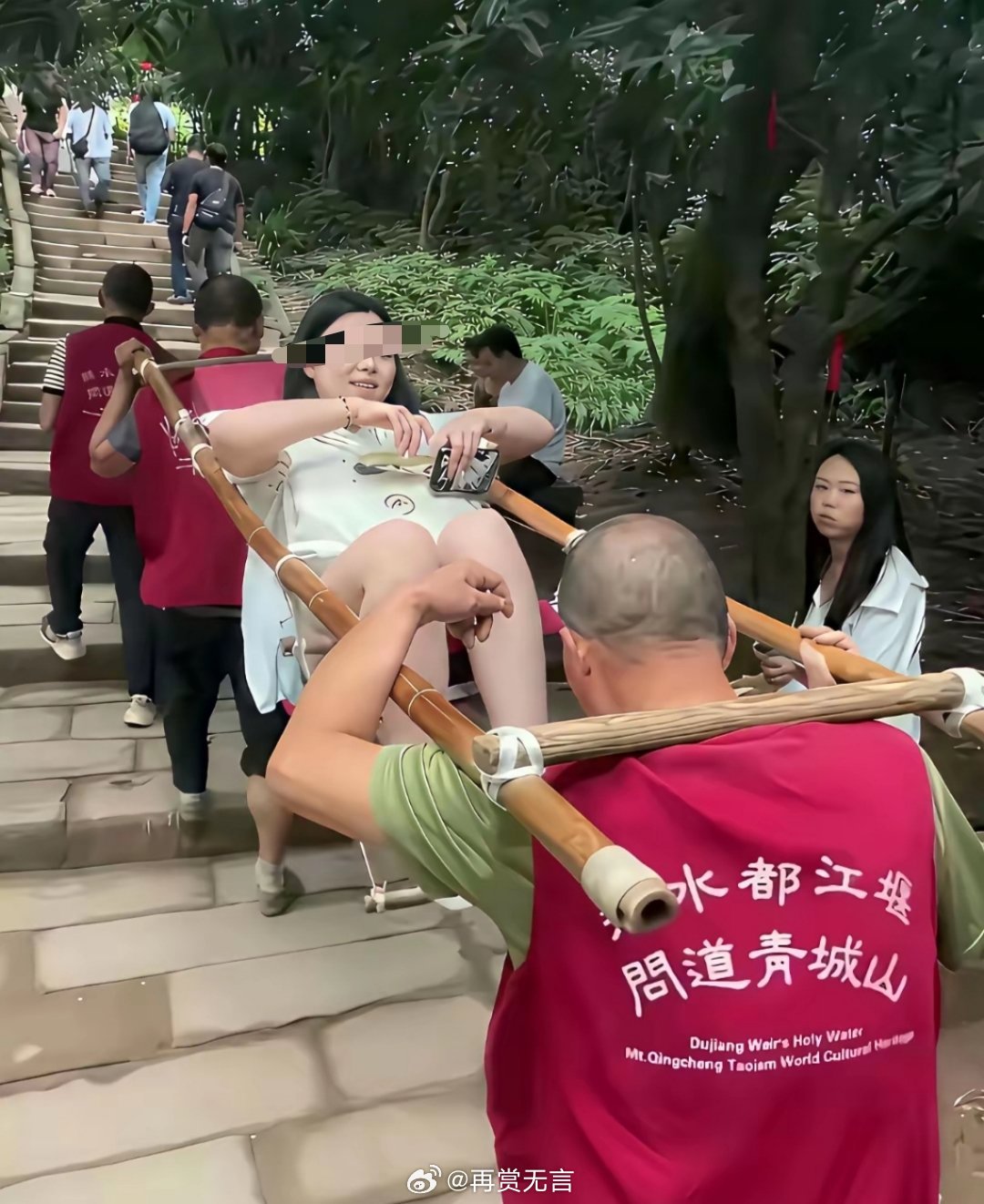 感觉师傅好辛苦啊,坐滑竿的女子,别的游客盯着她,她应该很尴尬吧!!