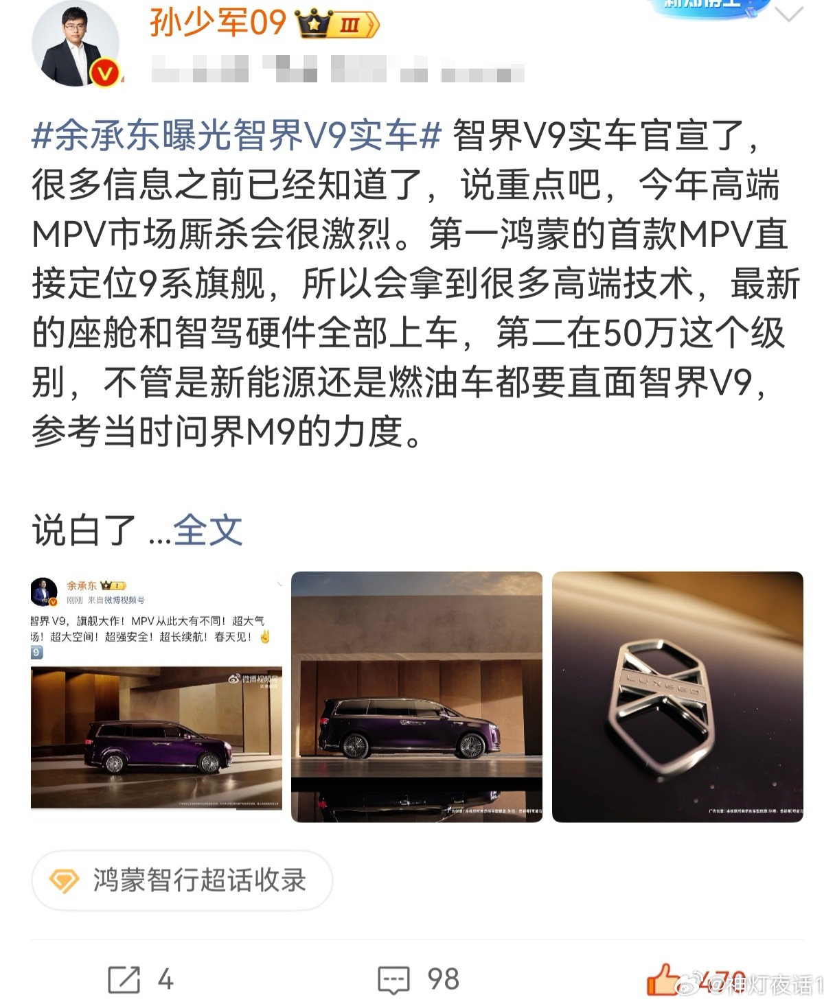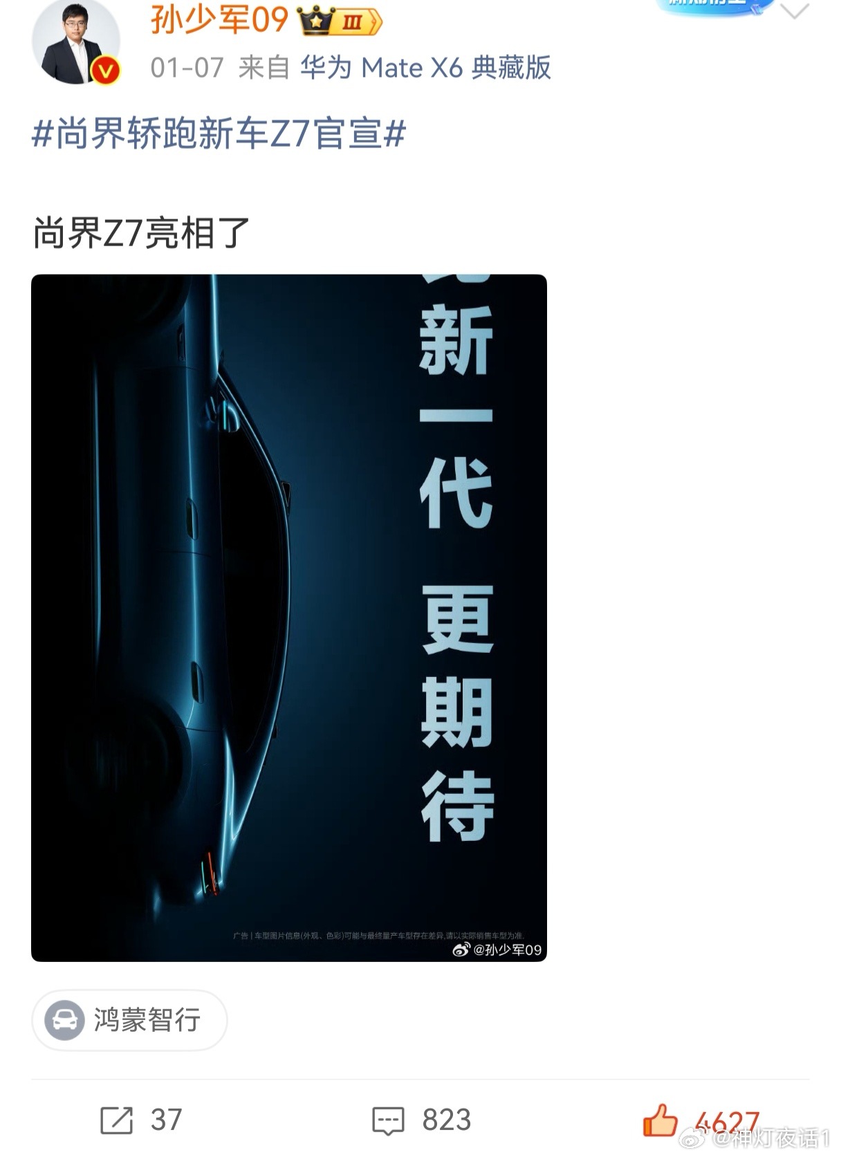 华为鸿蒙智行新一代的运动轿跑尚界z7,太期待了!这个外观图一曝光,我就觉得稳了! 绝对大卖!过去华为系的轿车,除了尊界s800统治力无敌,智界s7与享界s9销量都很一般,享界s9历经改款目前销量有起色,智界s7是真的扑街卖不动,但是尚界z7具备了一切大卖的潜质!有四个原因:第一,外观颜值对于年轻人有致命的吸引力!事实证明,运动轿跑它就得拉长车头,华为过去的onebox设计它就是不吃香!四轮汽车行业都快140年了,运动轿车所有好看的设计早就被发掘殆尽了,就不太可能原创一个和保驰捷完全不一样,还特别好看的车头出来,最多就是在整车曲线与细节造型上做一些调整。与此同时,保时捷发了个视频,最后一句话让人哭笑不得!我觉得尚界z7非常的惊艳!在前人的基础上做出更好看的改良,并且在其它各功能方面完胜对手就行。尚界z7发布以后,没准以后大家都叫它新一代的保时界了,何乐而不为!此时最尴尬的是智界s7:曾经有个做保时界的机会摆在眼前,我没有珍惜!第二,尚界z7曝光之后,热度相比尚界h5高了非常多,不论是各种媒体平台相关话题的点赞评论数据,还是各种车友群里的讨论,都可以用热火朝天来形容,仅就孙少军的相关博文,尚界z7的点赞是智界v9的10倍!也比提及的其他品牌车高的多,这次尚界z7真的有流量与影响力!第三,尚界z7是上汽全新一代平台开发出来的,各方面指标与先进性都是行业领先的,尚界h5大家都懂,是赶鸭子上架出来的,华为吸取教训与调整能力强的可怕,尚界z7的完成度绝对非常高!定价我认为低配20万,高配25万,产品力在这个价位非常有竞争力!第四,尚界z7的营销策略与战略定位,就是走当年的荣耀路线,与新一代su7同天公布外观,并且宣传海报上充满针锋相对的字眼“比新一代,更期待”,完全就是复刻当年的荣耀贴着打,这种战术方法论非常有效!另外,启镜的猎装运动轿跑,也按捺不住了,海报也打出来了“新形态,更期待,领先一代”,宣布6月发布。明年运动轿跑会进入白热化残酷的军阀混战神仙打架时代,各种牛逼车都要来分一杯羹,期待今年汽车行业的大争之世!华为 华为 鸿蒙智行 尚界z7 北京
