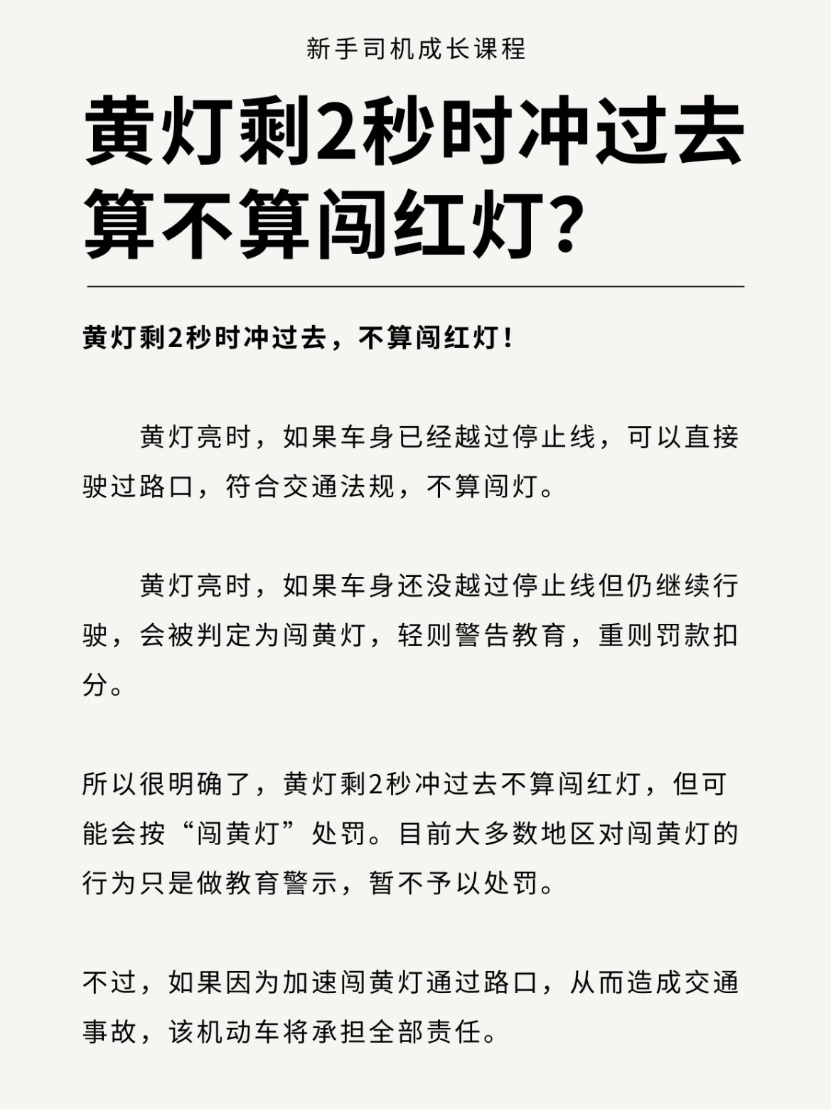黄灯剩2秒冲过去算不算闯红灯🚦先说答案:黄灯剩2秒时冲过去,不算闯红灯!✅黄灯亮时,如果车身已经越过停止线,可以直接驶过路口,符合交通法规,不算闯灯。✅黄灯亮时,如果车身还没越过停止线但仍继续行会被判定为闯黄灯,轻则警告教育,重则罚款扣分。所以很明确了,黄灯剩2秒冲过去不算闯红灯,但可能会按“闯黄灯”处罚。目前大多数地区对闯黄灯的行为只是做教育警示,暂不予以处罚。不过,如果因为加速闯黄灯通过路口,从而造成交通事故,该机动车将承担全部责任哦我与汽车的日常大v聊车