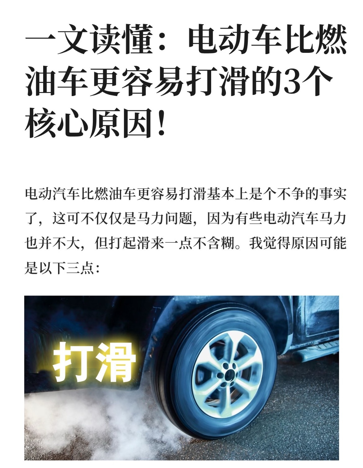 为什么电动车总感觉比油车更容易打滑?很多人以为打滑是马力大导致的,其实不少马力不大的电动车,起步或过弯时也容易“飘”真正的原因只有三个:1️⃣自重差异,轮胎压力更大电动车电池重,整车质量普遍比同级油车高不少。更重的车身压在驱动轮上,起步时若扭矩释放突然,轮胎抓地力更容易突破极限,导致打滑。2️⃣瞬间扭矩,毫无缓冲电机响应极快,一脚“电门”下去,最大扭矩瞬间全数输出,没有燃油车变速箱换挡的缓冲过程。这种“暴力输出”对轮胎抓地力是极大考验。3️⃣轮胎配置可能未同步升级部分车型为控制成本或续航,原厂轮胎性能未必跟上电机性能,尤其在湿滑路面,抓地力不足的问题会被放大。要改善其实也很容易,只要平稳控制电门,避免“地板电”起步,或者考虑升级抓地力更好的轮胎,善用驾驶模式,雨雪天使用“湿滑/节能模式”,这样都能改善我与汽车的日常大v聊车