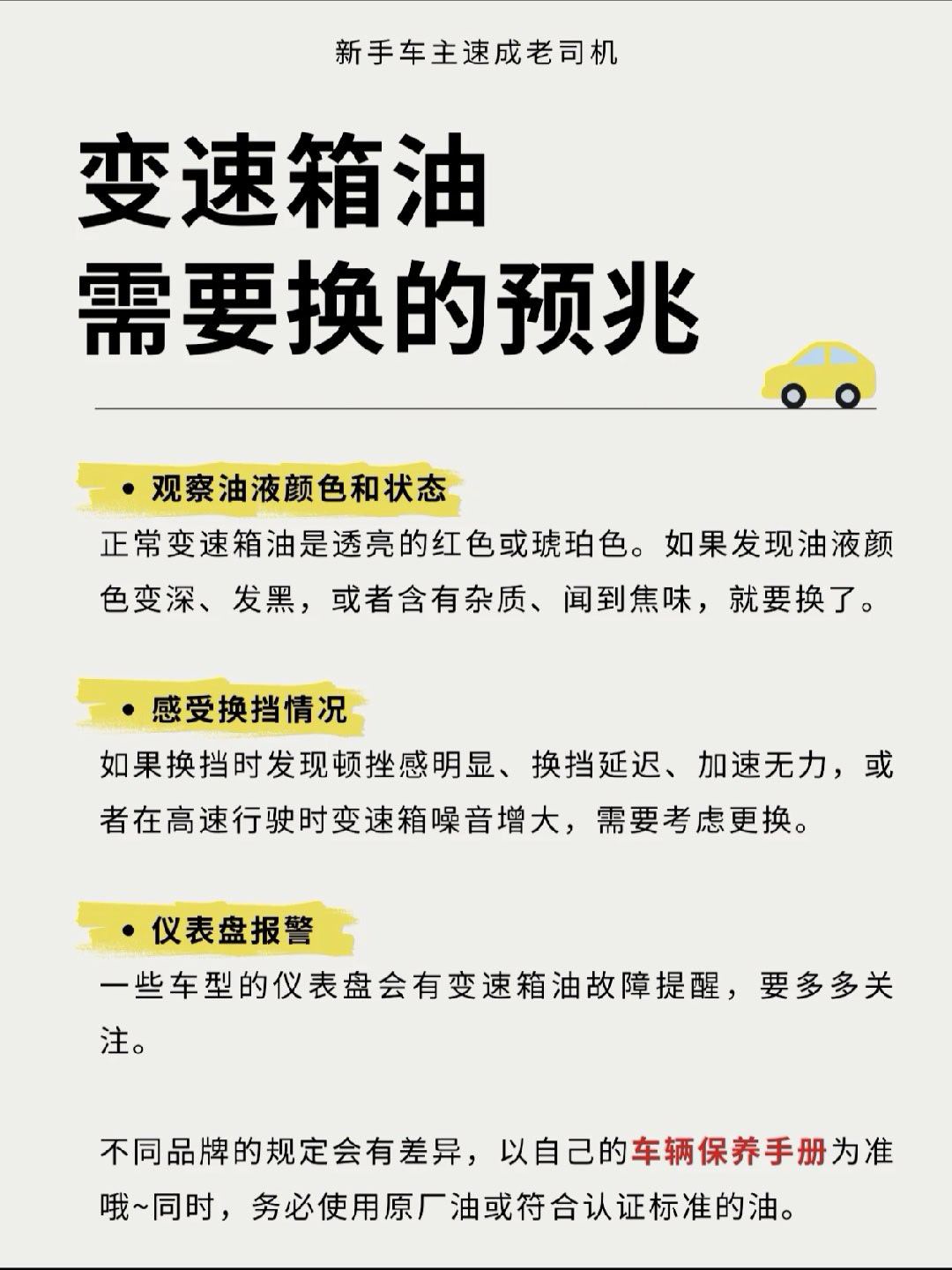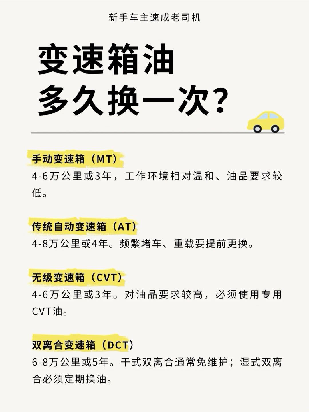 老铁们!变速箱油更换周期请收好,别再被忽悠啦!✅手动变速箱(MT):4-6万公里/3年✅自动变速箱(AT):4-8万公里/4-6年✅无级变速箱(CVT):4-6万公里/3年✅双离合变速箱(DCT):6-8万公里/5年。如果有以下信号就该换油了!1、油液发黑有异味2、换挡卡顿不顺畅3、踩油门加速无力4、仪表盘亮警告灯如果大家实在记不住,按自己车辆保养手册上建议的周期进行保养就可以啦~我与汽车的日常大v聊车