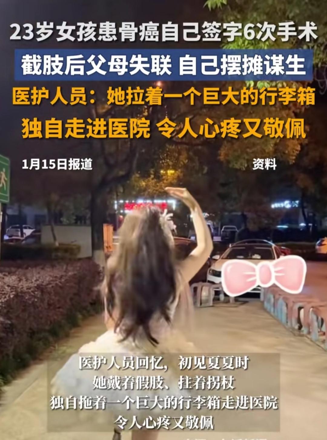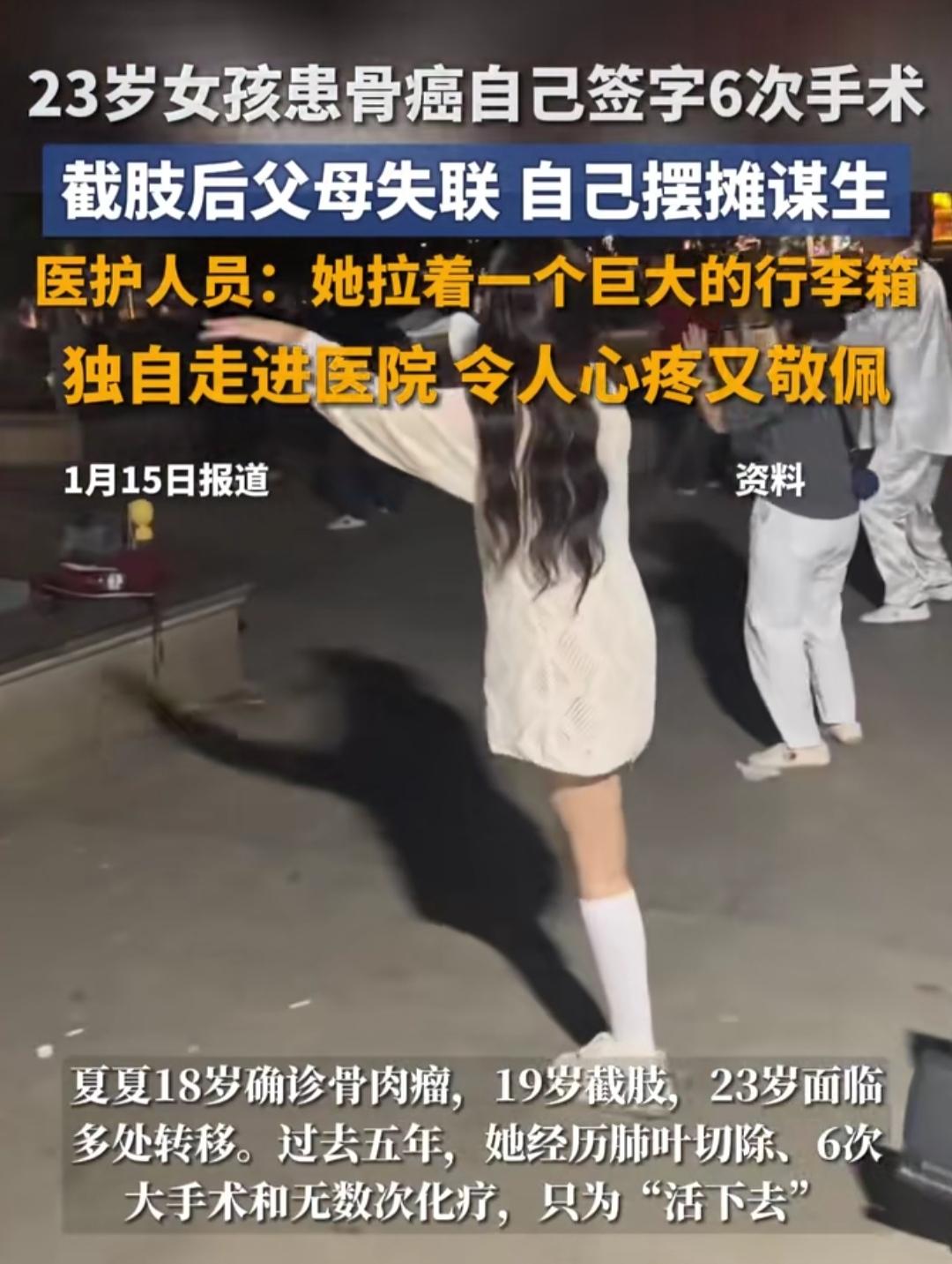 23岁本该是踩着阳光逛市集、和闺蜜分享奶茶的年纪,安徽这位姑娘却把青春耗在了手术室里。6次手术同意书,都是她咬着牙自己签的名,没有家人陪伴,没有依靠,全程独自面对骨癌的折磨和手术的风险。很难想象,她在落笔的那一刻,心里藏着多少恐惧和无助。 截肢手术后,本以为能等到家人的照顾,可等来的却是彻底失联。没有经济来源,没有避风的港湾,她只能拖着残缺的身体摆起小摊。风吹日晒里守着摊位,赚一点生活费维持生计,每一步都走得格外艰难,却从没见她向命运低头。 路过的人或许会好奇她的经历,却不知道这个看似坚强的姑娘,背后藏着多少不为人知的心酸。23岁的肩膀扛起了生命的重量,独自对抗病痛和孤独。她的故事没有答案,却让人忍不住想,家人的缺席,到底给她的人生留下了怎样的印记?