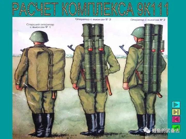 BMP-2可以兼容9M111反装甲导弹,但并未配备 BMP-2步战车配备9P135型发射系统可以兼容9M111和9M113导弹,但9M111更是作为步兵便携使用。 全系统重23.5千克,其中弹重12千克,弹径135mm,弹长1200mm,飞行速度为185米/秒,射程70~2000米,破甲厚度400mm。这点重量对人高马大的斯拉夫士兵而言,背负两枚完全没有困难。一般3人一个战斗小组,一人背发射器,两人各背负2枚导弹。