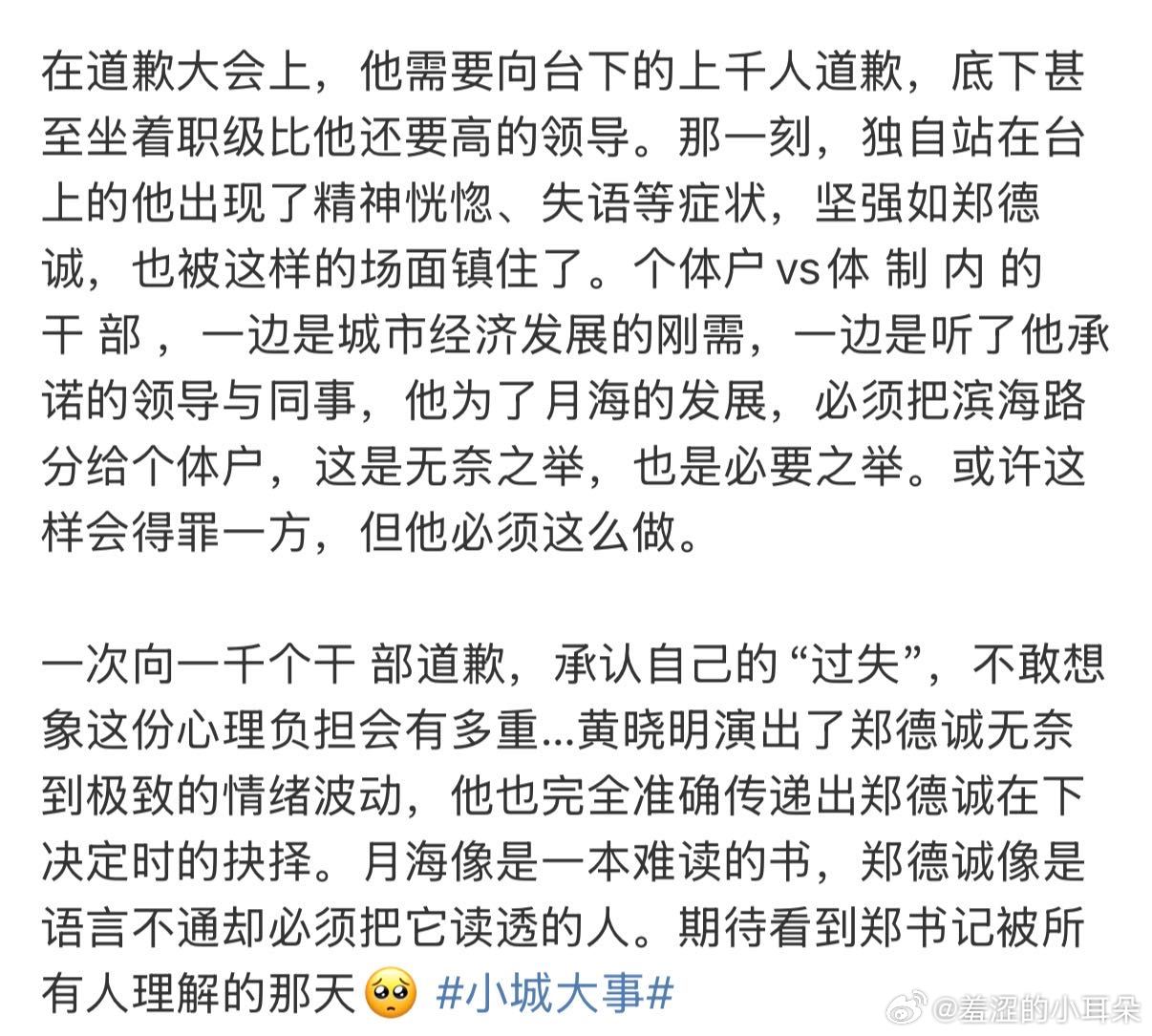 妈呀,黄晓明在 小城大事 的这段道歉戏真的太精彩了,在处理滨海路到底给谁的问题上,郑德诚坦言干部和老百姓不应该对立,是自己不够冷静太着急以至于造成这个局面。道歉的时候不卑不亢,做错了就勇敢承认错误,郑德诚这段完全高光来着!郑德诚向上千人道歉