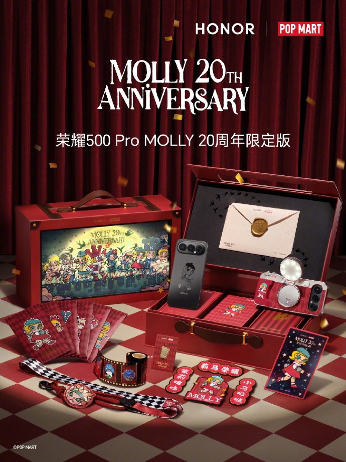之前谣传的泡泡玛特手机,实机终于来了。这个荣耀500 Pro MOLLY 20周年限定版礼盒看起来确实不错,尤其这个影像套装,胶片机的味儿