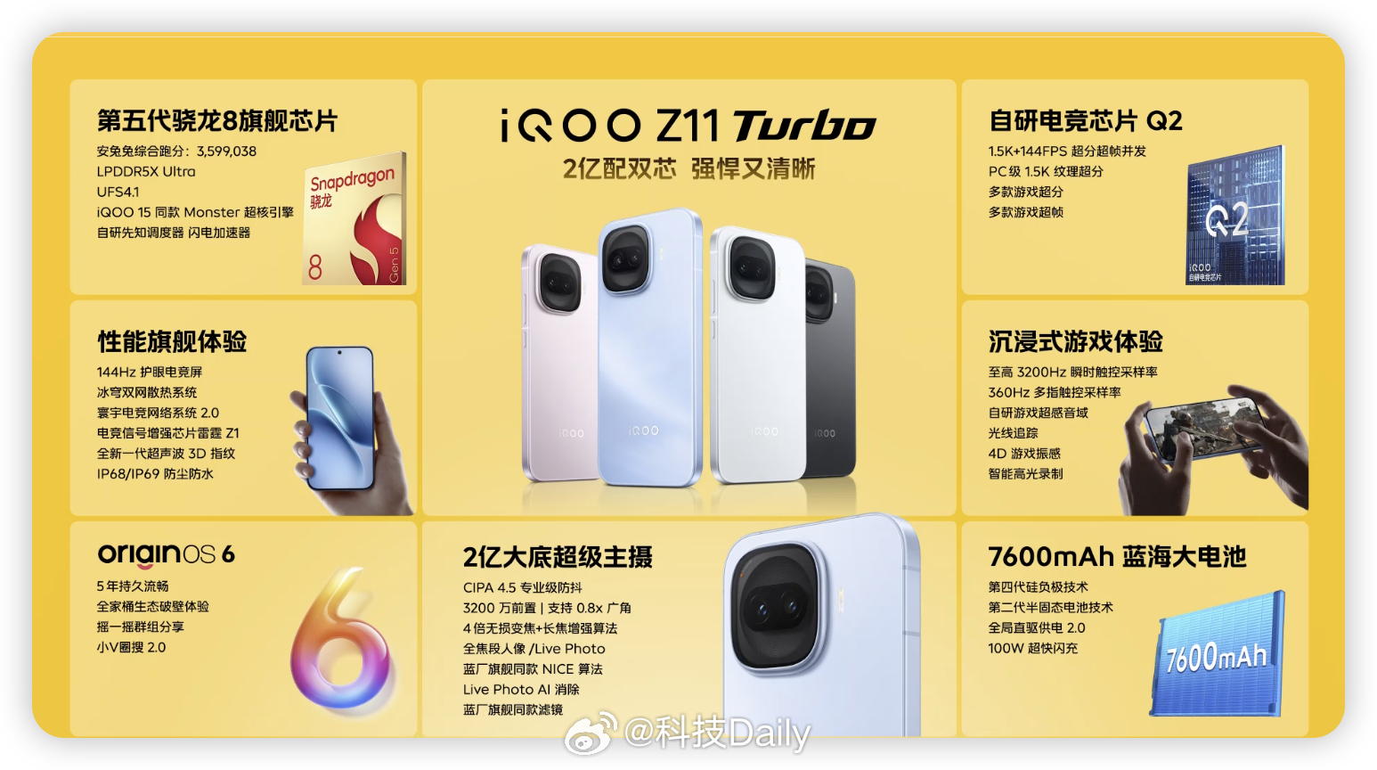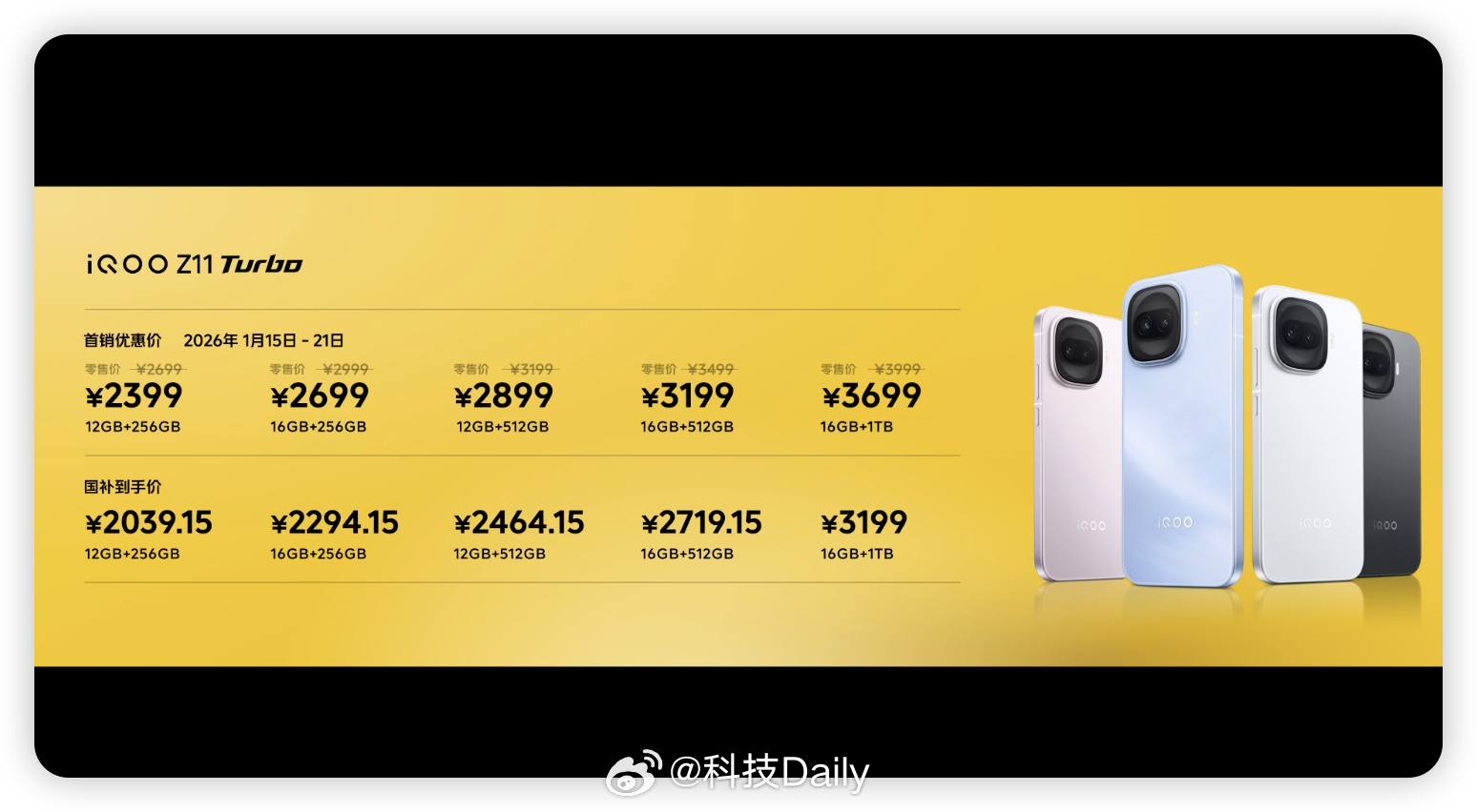 iQOO Z11 Turbo,价格揭晓! 2亿拍照好,双芯性能到位,各方面全满足。12+256GB,2399元,叠加国补仅为2039.15元起,是不是很香。
