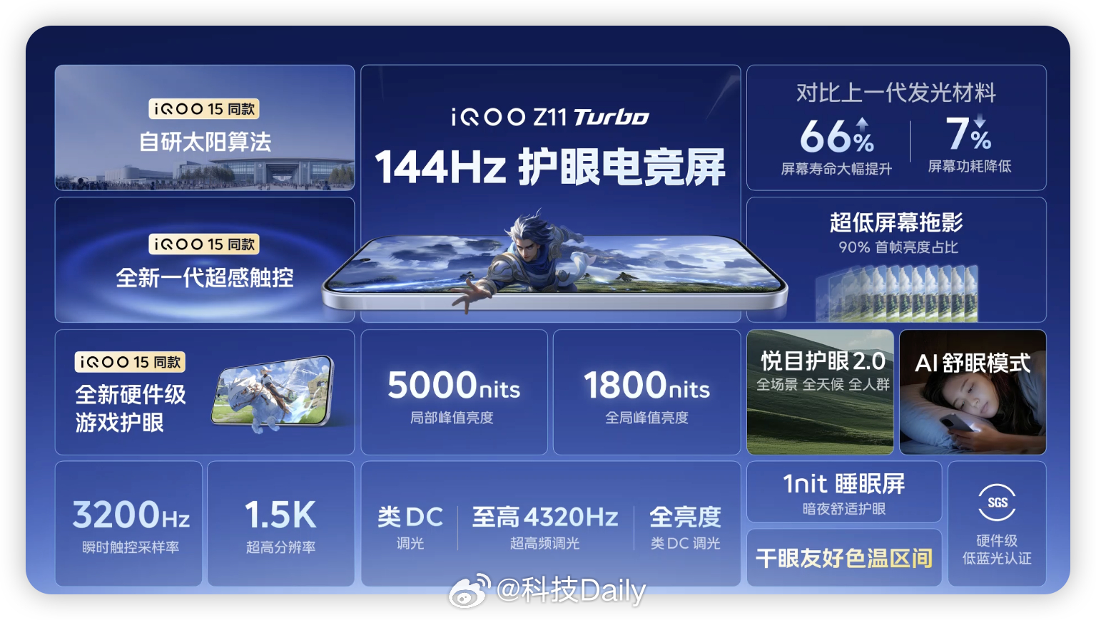 iQOO Z11 Turbo,2亿像素拍摄超清晰,2亿超大底主摄随手拍都很赞,还有4倍无损变焦,远近清晰,搭配蓝厂算法,拍照效果绝了!同时新机也有好信号真可靠,24根环绕式天线,漫展也能稳定在线不失联。屏幕呈现方面,144Hz护眼电竞屏,好屏真到位,超低屏幕拖影,舒适护眼,晕动视觉辅助,各方面考虑周到,还支持1nit睡眠屏。最重要的是这块屏幕时延低特别跟手,玩游戏简直绝了。