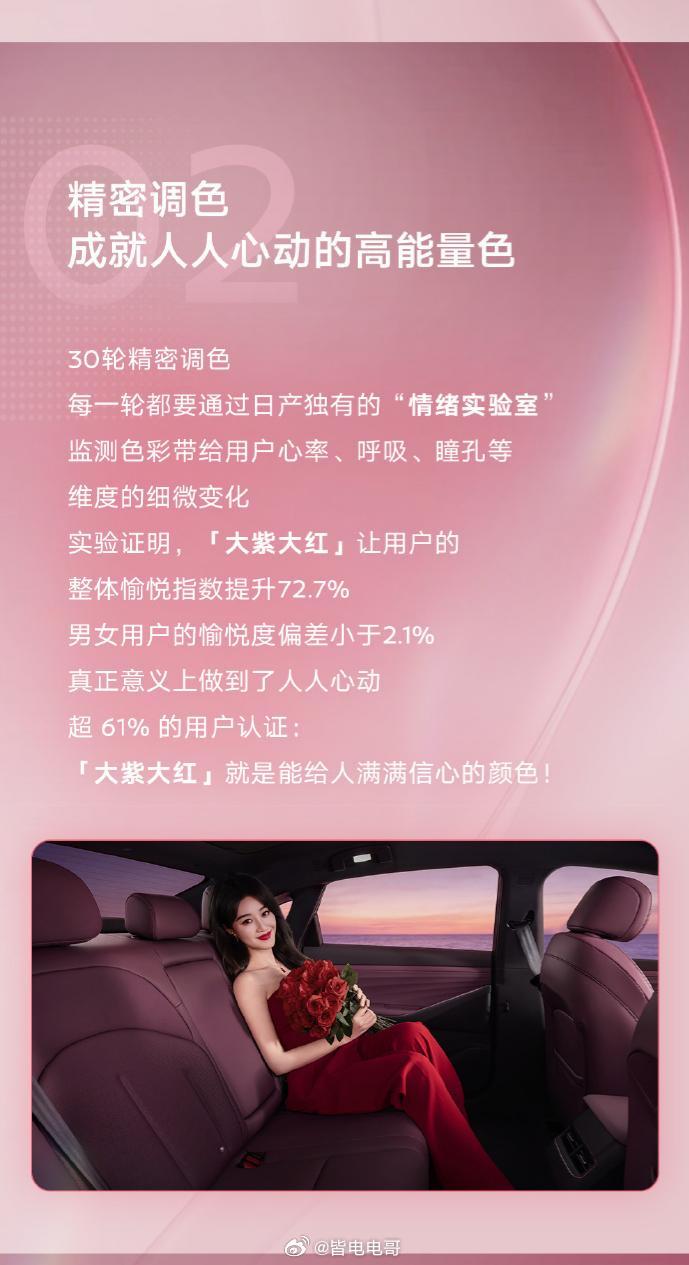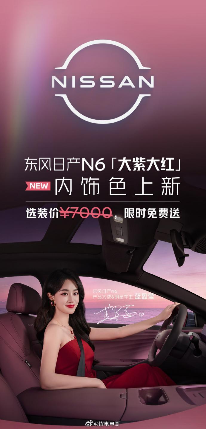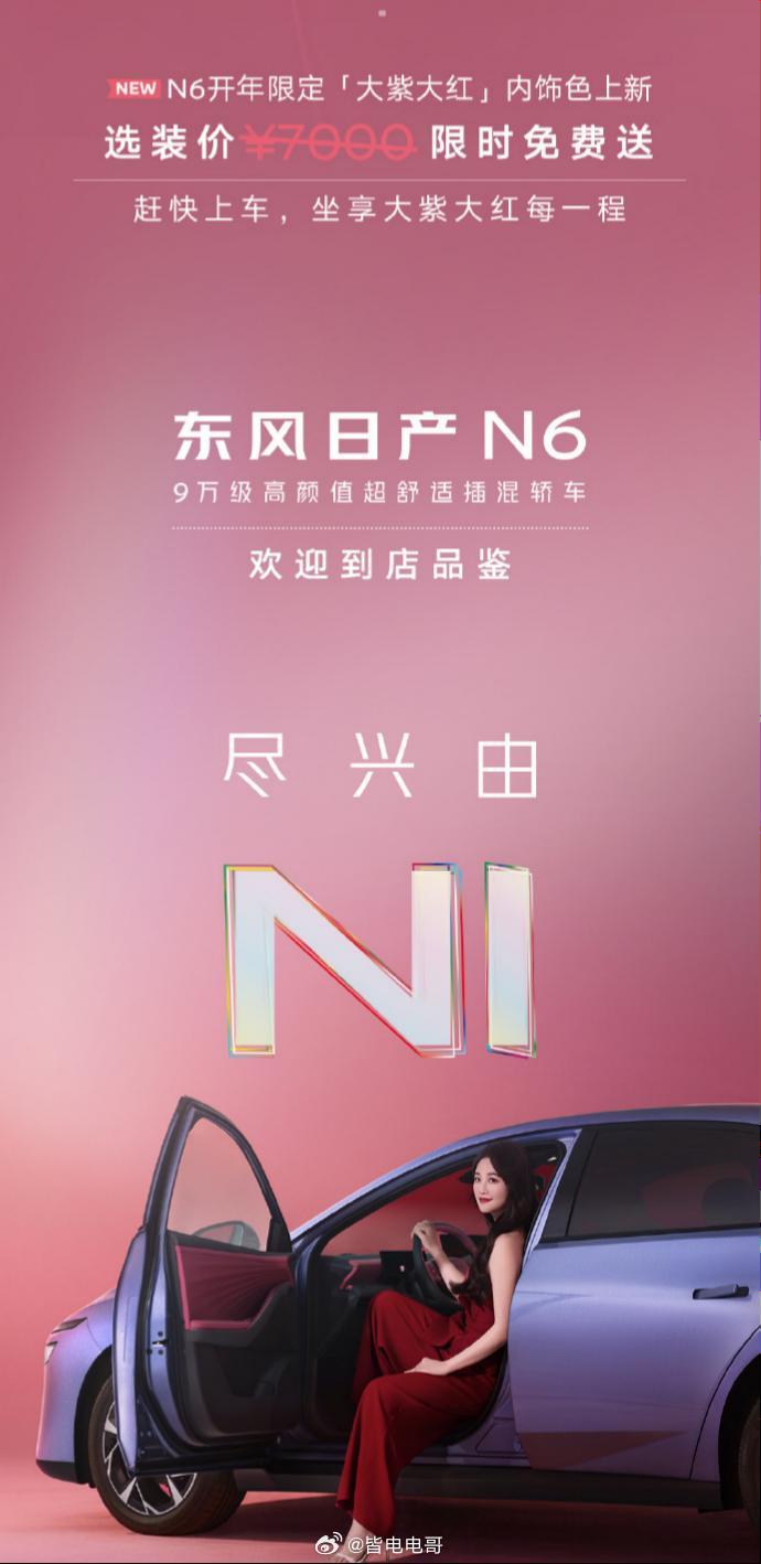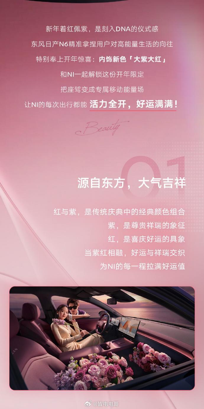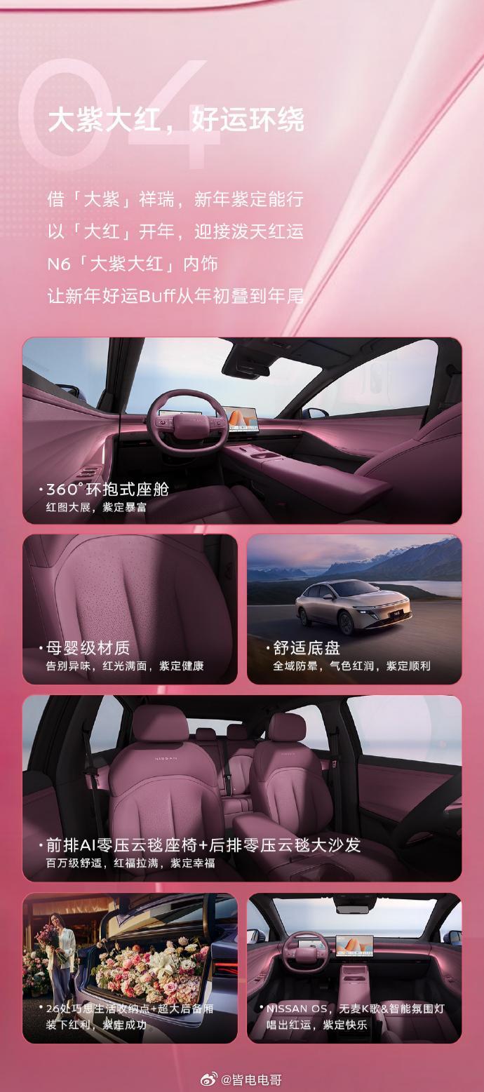 东风日产N6新增开年限定内饰颜色“大紫大红”,选装价格7000元,限时免费送。该车售价为9.99-12.99万元,上市10天订单就突破一万台。“大紫大红”内饰挺有意思的,内饰的实际颜色并没有名字这么高饱和度,反而是比较舒服的调色,有着吉祥如意的名字同时,还有高级感的视觉效果,这样的内饰你会喜欢吗?n6开门红盈莹新年开大紫大红N6东风日产N6