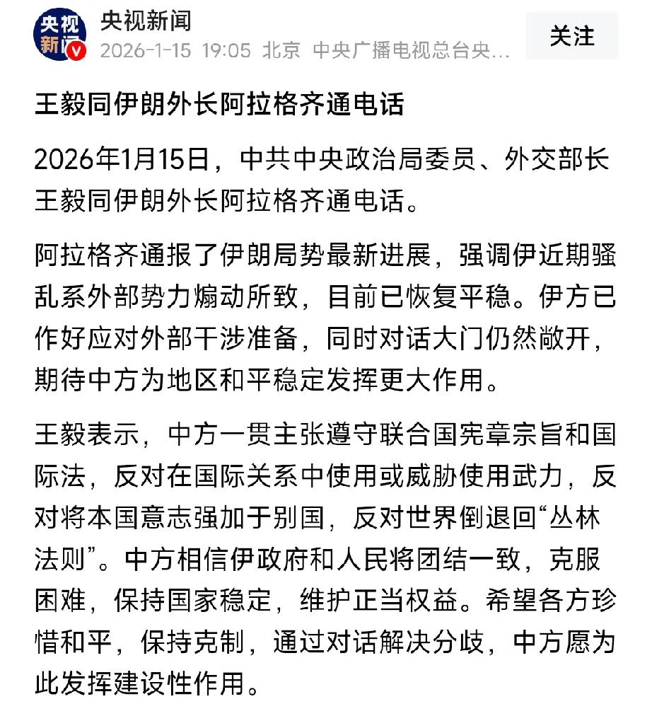 中俄救了伊朗! 在美国武力干涉伊朗问题上: 俄罗斯的立场是“绝不可接受”——暗含军援伊朗。 中国的立场是“反对武力支持对话”——暗含不要欺人太甚。 结果: 现在的伊朗重新开放了领空,杀气腾腾的美军也已偃旗息鼓不敢妄动。 尤其是以色列,更是通过俄罗斯渠道向伊朗提前说明以色列不会参与空袭伊朗。 这是什么? 这就是金砖组织实实在在的影响力!