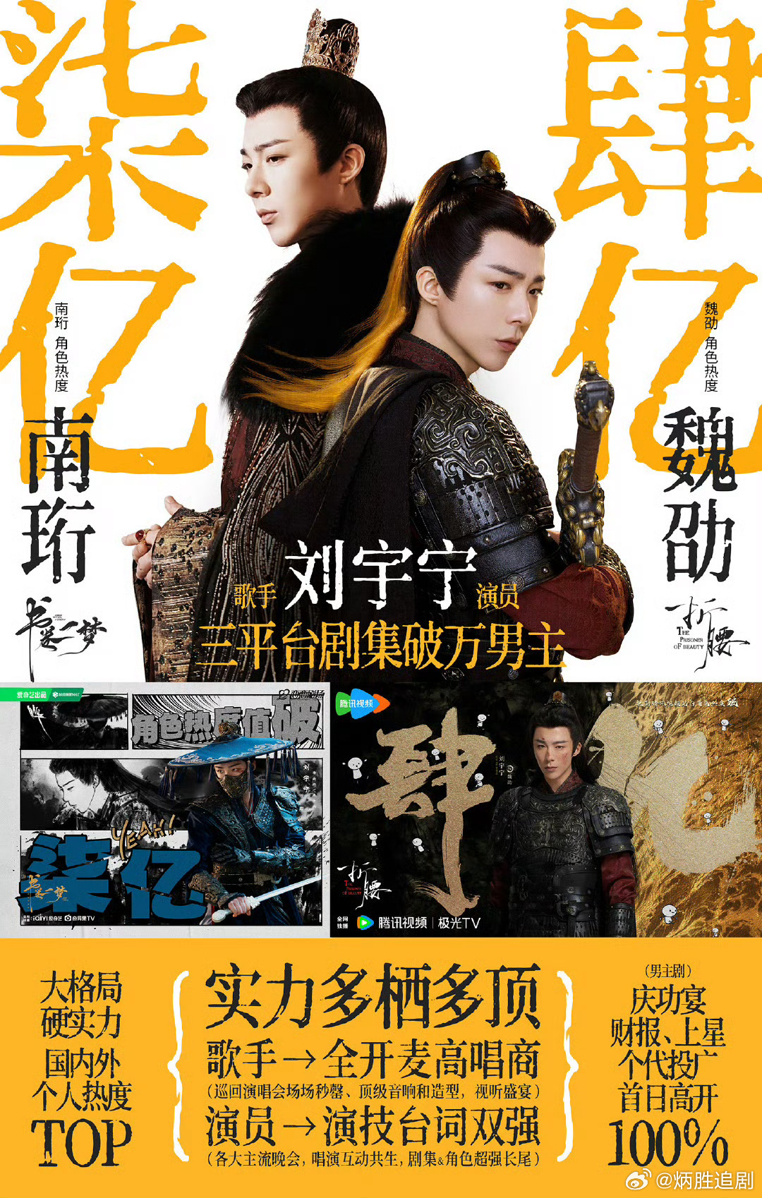 酷云数据显示,刘宇宁在《折腰》中饰演的魏劭,热播期角色热度稳居腾讯、爱奇艺、芒果三平台第一,角色与演员双双大爆