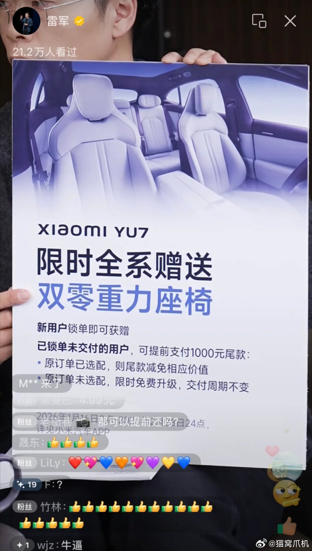 yu7和小米su7推出7年低息政策算下来首付5万,每月只需要2593。雷总口误只