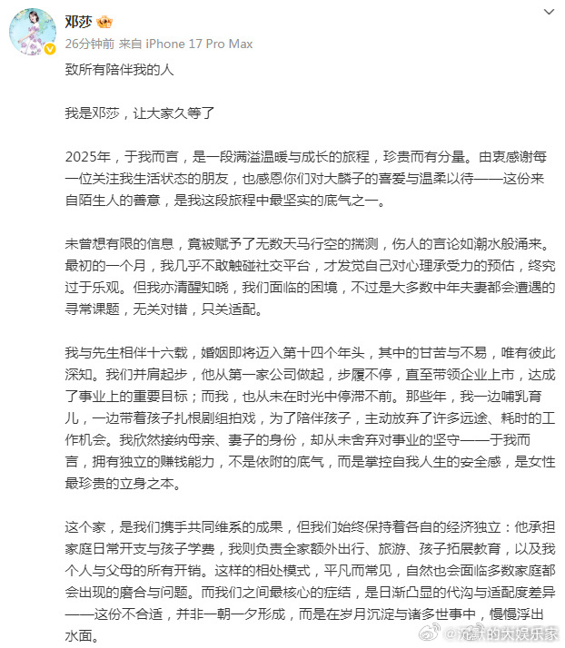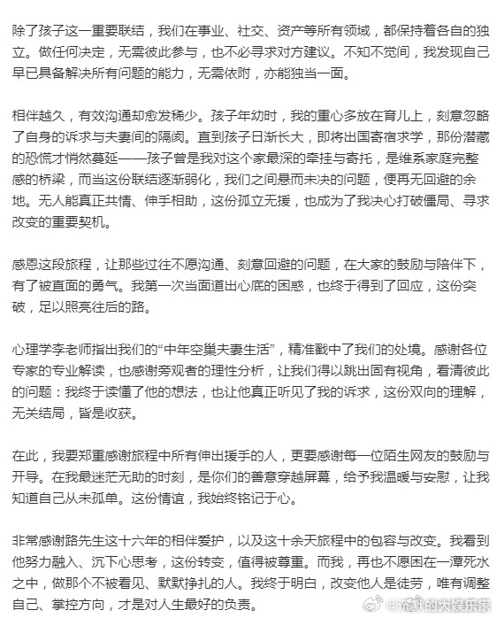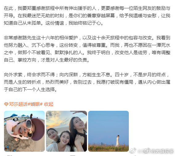 网友们说邓莎既要又要,我请问,她找自己老公要有什么问题呀,而且确实她老公就是爱她的呀,只是她想换一种可看得见的热烈一点的方式,路行给的是包容的拖底式的爱。其实他俩没什么问题,两个人情绪都非常稳定,只是年龄问题需求不同导致的沟通问题。两个人有世俗意义的合适却没有灵魂的契合,能过但是却不快乐。邓莎说打破僵局,做出下一个人生选择。除了离婚还有什么选择可以打破僵局呢?不离婚的话就是维持婚姻,不存在打破,她也说了,另一半很难改变,也不打算改变他了,大概率两人是离婚了吧。邓莎疑似官宣离婚