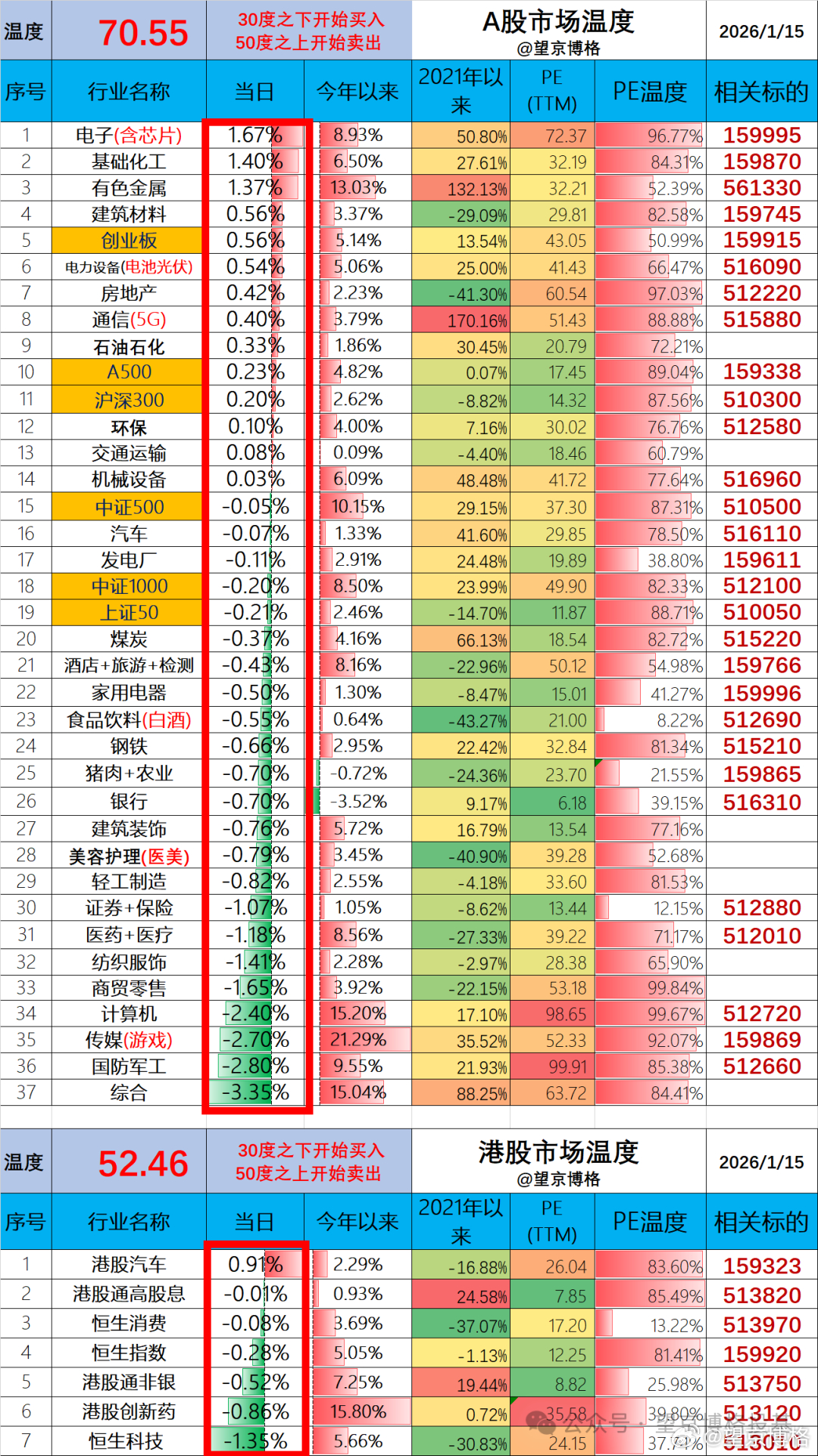 (1)场内ETF账户今日亏损2.9万(资产260万);在涨停板减仓1/3卫星之后,卫星今天又大跌。但是博格继续看好今年商业卫星前景,继续持有ing,但不建议没有卫星持仓的朋友回调建仓。传媒也跌了,但是博格昨天发车就说了,mini仓位建仓传媒后续再看情况加仓,所以今天回调不加仓。(2)场外基金账户今日盈利0.5万(资产550万);主要靠资源与主动盈利了两个账户合计亏损2.4万,亏损比例0.3 %周一盈利11.0万,周二亏损2.0万,周三盈利4.2万,周四亏损2.4万,本周累计10.8万盈利,算是不错了。重点!盘后央妈宣布继续降息!这种消息可以看作与之前“提高融资保证金比例”的利空对冲了不少。A股今天70.55度,相比上一个交易日下降0.3度;港股今天52.46度,相比上一个交易日下降0.2度;结论:现在能加仓的资产不多了,也就消费还处于比较低的估值,博格找机会再加一点消费汉堡吧。大家今天盈亏如何?欢迎留言~感谢点赞与点爱心~基金a股