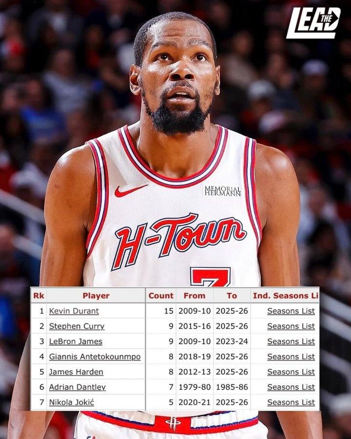 赛季场均25+且真实命中率60+%次数: 15次 —— 杜兰特 9次 —— 库里、詹姆斯 8次 —— 哈登、字母哥 7次 —— 丹特利 5次 —— 约基奇 4次 —— 乔丹、恩比德、巴克利、亚历山大、贾巴尔 杜兰特生涯至今,只有3年的真实命中率低于60%。 2007-2008赛季:51.9% 2008-2009赛季:57.7% 2010-2011赛季:58,9% 如果把真实命中率的要求降低到50%,那杜兰特生涯至今全部达标! 杜兰特、詹姆斯、库里三个人相比,詹姆斯是相对艰难的一人,因为他的罚球太臭了,至少和杜兰特、库里不是一个档次,因此拉低了他的真实命中率。且詹姆斯的罚球是硬伤,生涯这么多年就是练不出来,他自己也放弃治疗了。