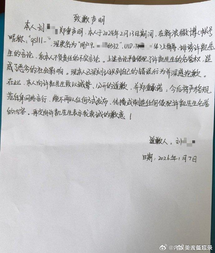 许凯告黑成功。而且告的是诽谤。黑粉手写道歉信!支持许凯维权