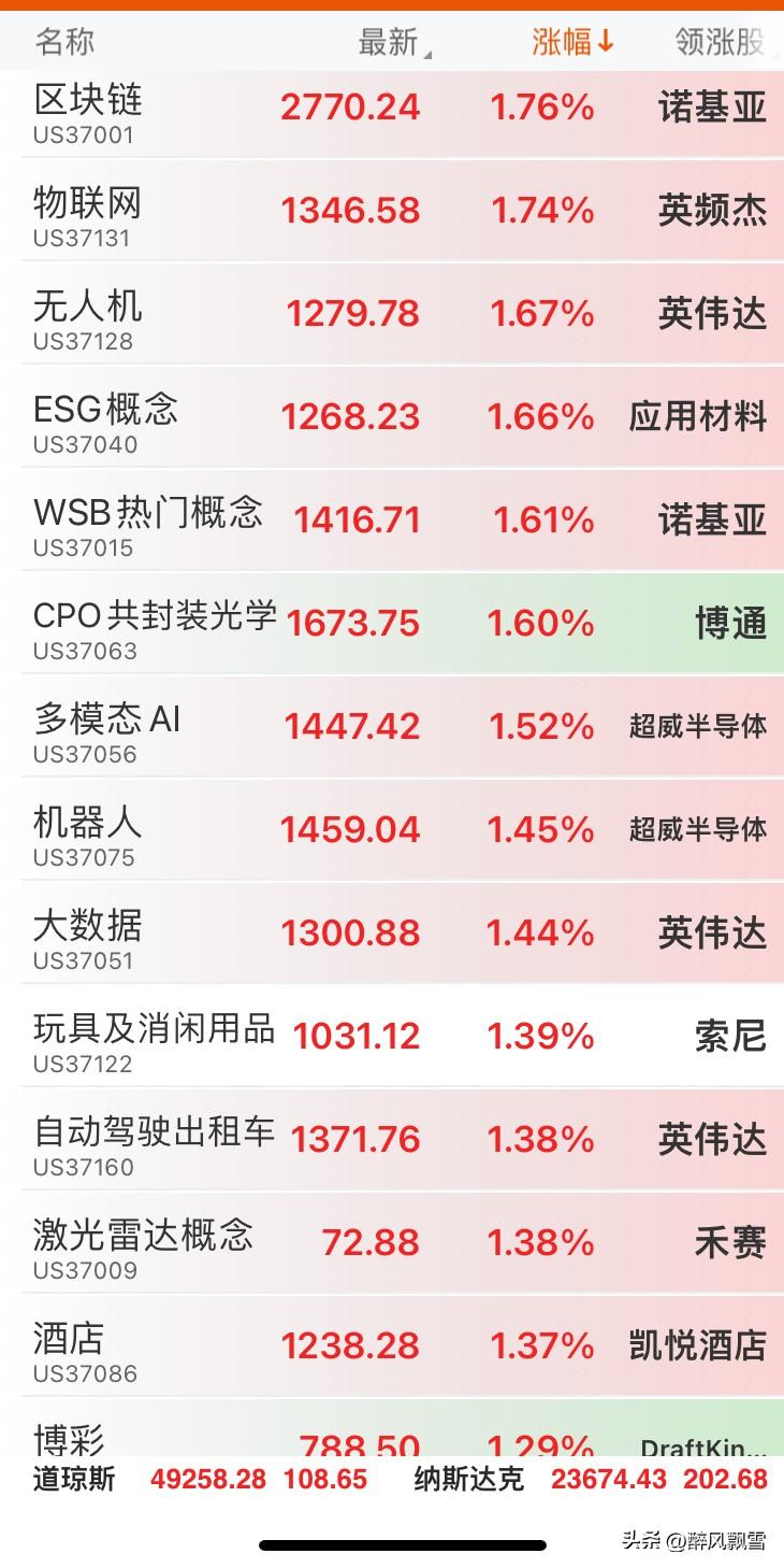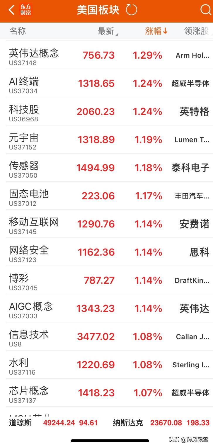 美市开盘,指数高开高走 1月15日开盘5分钟数据,明天早上跟踪。 大A今晚消息面:降息催化,明天上涨收阳,指数修复! 美股三大指数高开高走,道琼斯指数上涨0.30%,纳斯达克指数上涨0.77%,标普500指数上涨0.59%。板块层面科技股领跑,OLED概念涨幅4.44%,集成电路、光纤板块涨幅均超3%,AI终端、AIGC等科技细分同步走高;商业航天板块下跌0.39%,中概股板块微跌0.01%,与科技主线形成明显分化。