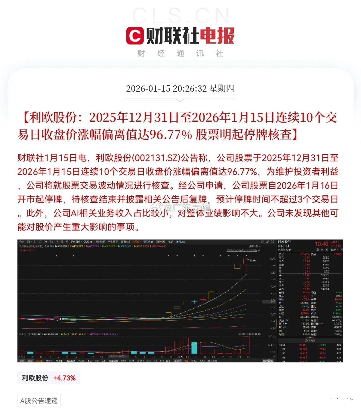 利欧股份!就在刚刚!利欧股份停牌核查了!怕什么来什么,利欧股份晚间也被“晾一边”了,持有的股民们今晚恐怕要掀桌子了!晚间8点26分,利欧股份突发公告称,公司股票从2025年12月30日至2026年1月15日,连续十个交易日收盘价涨幅偏离值达96.77%,股票明起停牌核查,预计停牌不超过3个交易日,公司同时宣称AI相关业务收入占比较小,对整体业绩影响不大,此消息一出,股民们都群情激愤,表示不服,半个月涨幅还不到100%,这涨幅怎么就过大了,怎么说停牌核查就停牌核查,公司这种做法有点任性了,很多股民认为反倒是那些跌跌不休的公司更需要停牌核查,要一视同仁才行,市场需要公平对待!对于这种随着停牌行为有关部门需要引起重视,或者出台更加明确,更加合理的规则才行,总而言之,这个停牌核查对于公司股价来说是个不小的利空,甚至对整个市场情绪都有影响!股民们!坐稳扶好!受此消息影响,利欧股份复牌后要大变天了,今晚估计很多人又要失眠了!