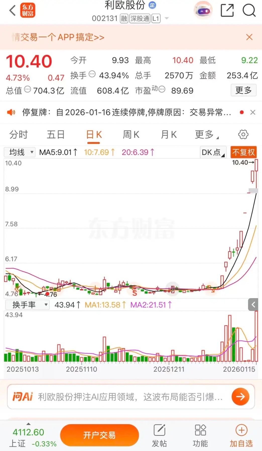 利欧股份停牌核查,盛路通信地天板,荣盛发展明日涨停盛路通信涨停收盘报收14.67元每股,成交金额39.45亿,明日看来一字板涨停了。大哥利欧股份停牌核查,今日收盘报收10.40元每股,成交金额253.4亿,涨幅4.73%,总市值704.3亿,未来千亿市值有望。荣盛发展跌幅2.96%,收盘报收1.64元每股,成交金额3.67亿,明日涨停1.80元,有可能开启连板模式。把握节奏,2026年沪指5000点可期