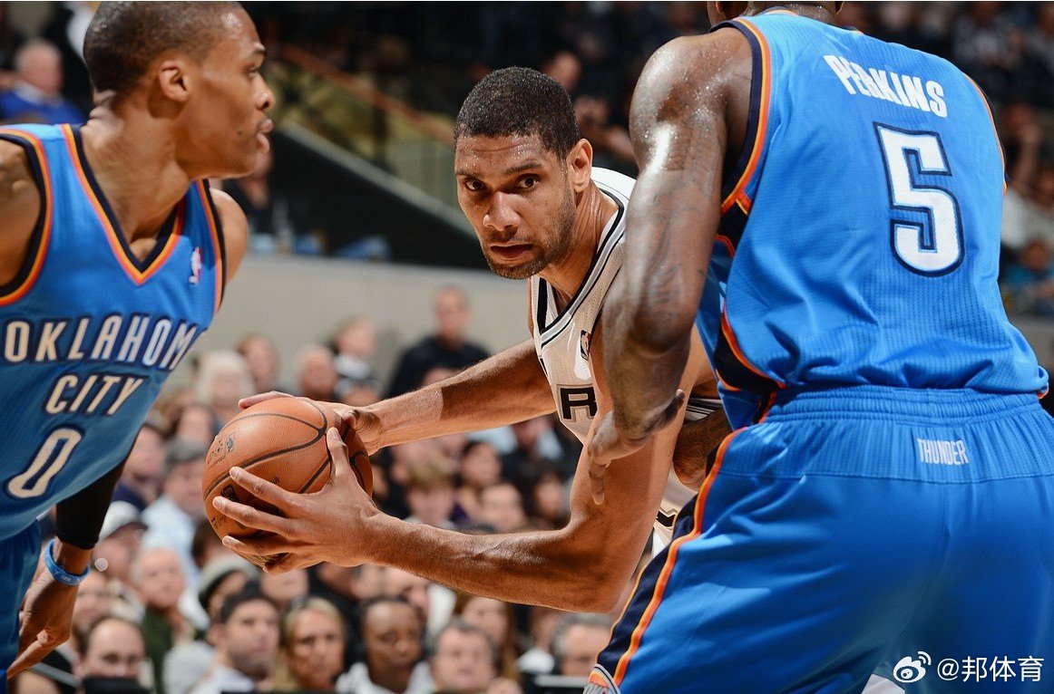 【NBA常规赛:马刺105-93雷霆】北京3月12日,圣安东尼奥马刺队(49胜15负)赢得西部巅峰对决。虽然维斯布鲁克和杜兰特联手得到51分,但斯普利特得到21分和10个篮板,莱纳德得到17分,马刺队后来居上在主场以105-93战胜俄克拉荷马城雷霆队(47胜17负)。