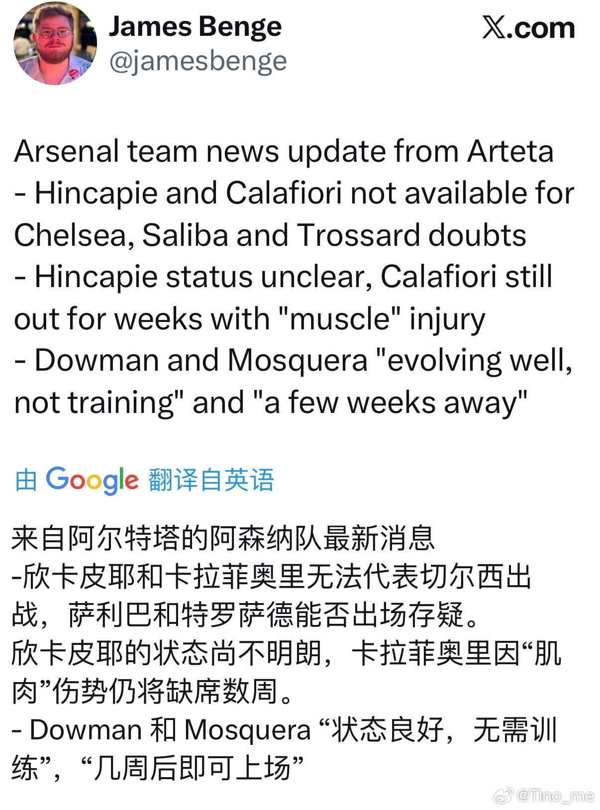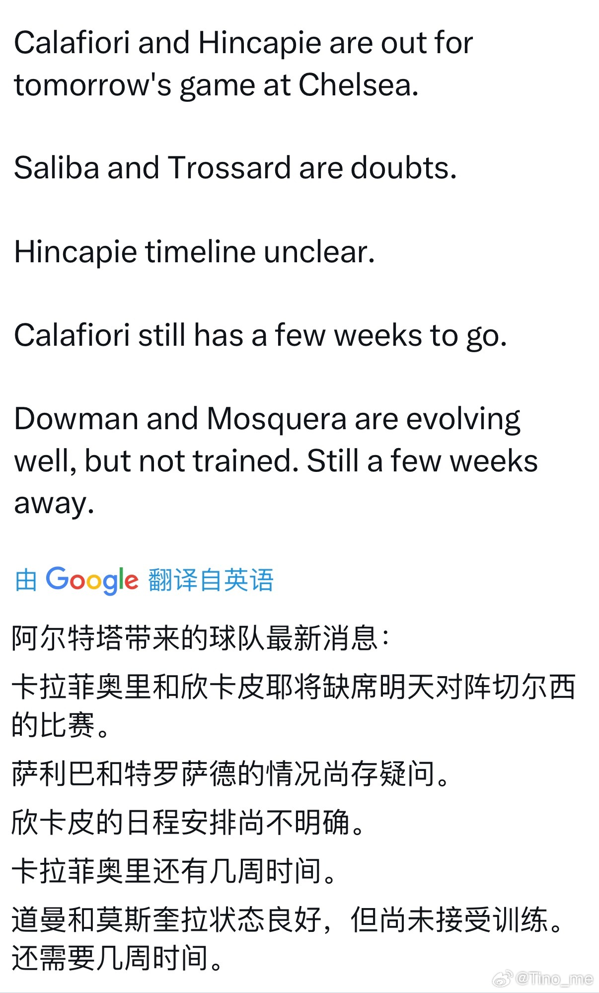 阿尔特塔赛前伤病更新:咖啡和因卡皮耶缺席和切尔西的联赛杯比赛。咖啡“肌肉伤势”还需几周,而因卡没有还明确的回归时间表。萨利巴和特罗萨德参赛成疑。道曼和莫斯克拉恢复良好,但还没参与训练,还需要几周才能回归。