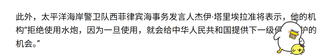 菲律宾:绝不使用水炮还击。从菲律宾海警发言人塔里埃拉在“菲律宾之星”网站上的表态来看,菲律宾只是疯,可一点不傻,知道没有开第二枪的机会,1988年314赤瓜礁海战的含金量还在提升。