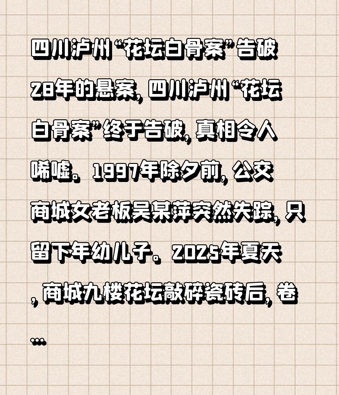四川泸州“花坛白骨案”告破 四川泸州“花坛白骨案”告破,这桩尘封28年的悬案终于水落石出,真相令人感慨不已。1997年除夕前夕,公交商城女老板吴某萍突然人间蒸发,只抛下年幼的儿子。2025年夏天,商城九楼花坛的瓷砖被敲碎,卷曲白骨重见光明。 起初,警方在全国失踪人口库中未能查到死者信息。民警经过大量走访,才了解到吴某萍已失踪28年。两张老照片成为破案的关键线索,一张照片中她的衣着与白骨残留衣物相符,另一张里她所戴的戒指却在现场不见踪影,这不禁让人怀疑是谋财害命。结合“远抛近埋”的规律,民警将目标锁定在商场内部人员,最终成功抓获嫌疑人。这起案件让正义在28年后得以伸张。