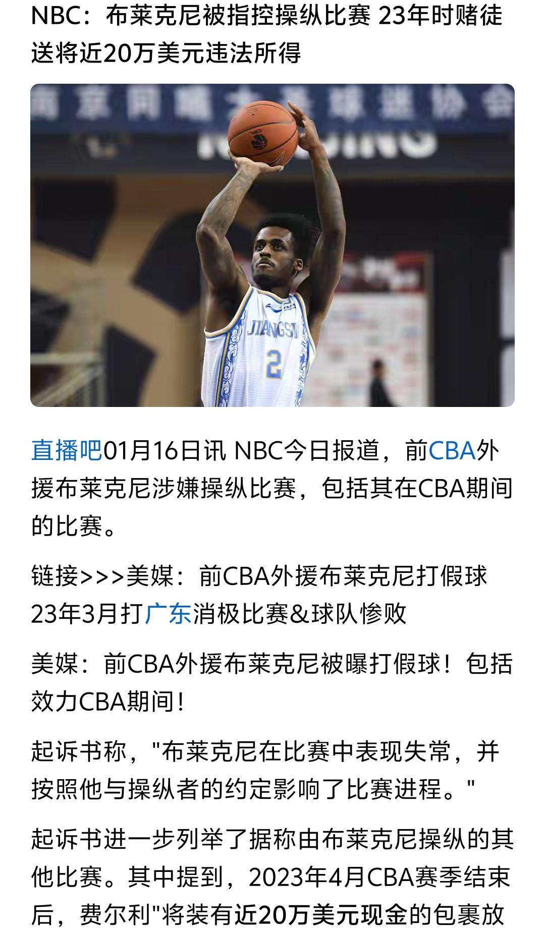 CBA前江苏外援布莱克尼涉嫌打假球,操纵比赛,还涉及到CBA比赛? 我想这是今天我们国内最大的体育新闻了?到底布莱克尼在CBA打了那些假球,操纵了哪些比赛,收了多少人的钱,这个恐怕需要查证后公正透明的公布一下吧! 之前某媒体人表示中国足球可以有假球,但是CBA一定不会有假球,最多是默契球,但是布莱克尼打假球、操纵比赛如果属实,这真的太打脸了! 但是如果真的有问题,还是应该尽早查出来,哪个俱乐部,哪个球员出现的问题一定要严惩不贷,把这股歪风邪气一定要扼杀在初始阶段!
