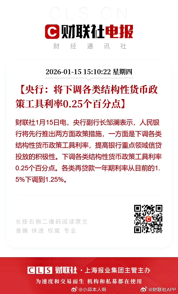 央行刚刚宣布:把几类“定向贷款”的利率都降了0.25%,比如专门给小微企业、农业、科技企业、绿色项目用的那些便宜贷款。打个比方,以前银行拿1.5%的利息从央行借钱去支持这些领域,现在只要1.25%——成本更低了,银行就更愿意放贷,企业借钱也更便宜。
