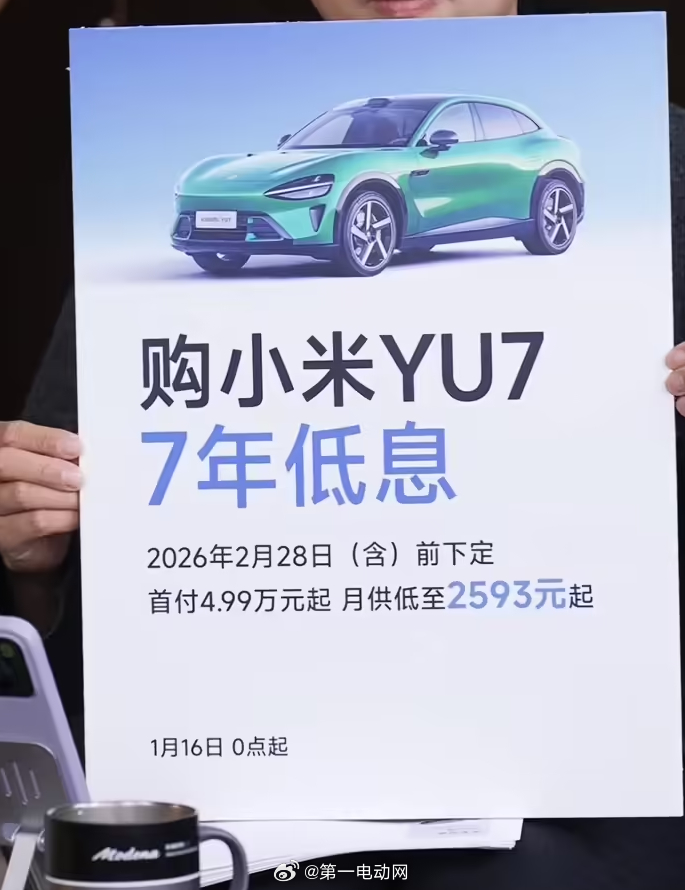 雷军直播 小米 YU7 也推出“7 年低息”政策 小米YU7全系推出7年低息购车政策 2026 年 1 月 16 日 0 点起,到 2026 年 2 月 28 日(含)前下定,首付 4.99 万元起,月供低至 2593 元起。雷军:“特斯拉最近推出了“7 年低息”的金融政策,这个政策一出来以后,不少网友在他的微博下面留言,呼吁小米推出“7 年低息”,这几天小米汽车团队紧急研究了一下,然后也紧急推出一个“7 年低息”的政策”特斯拉推出7年超低息购车