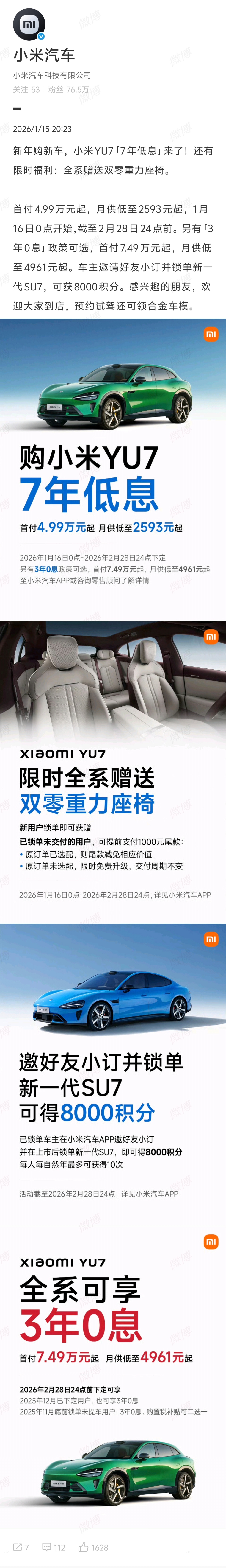雷军回应特斯拉7年超低息购车小米一直都说特斯拉值得学习,这不,小米YU7的7年低息马上安排上了,我是真想不明白啊,特斯拉、小米销量都这么好,这是何必呢?